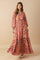 A printed woven maxi dress featuring surplice neckline, long sleeve with smocked cuff, smocked waist band and ruffled hemline