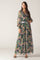A printed woven jumpsuit featuring surplice neckline, long sleeve with smocked cuff, elasticized waist with self belt and wide leg