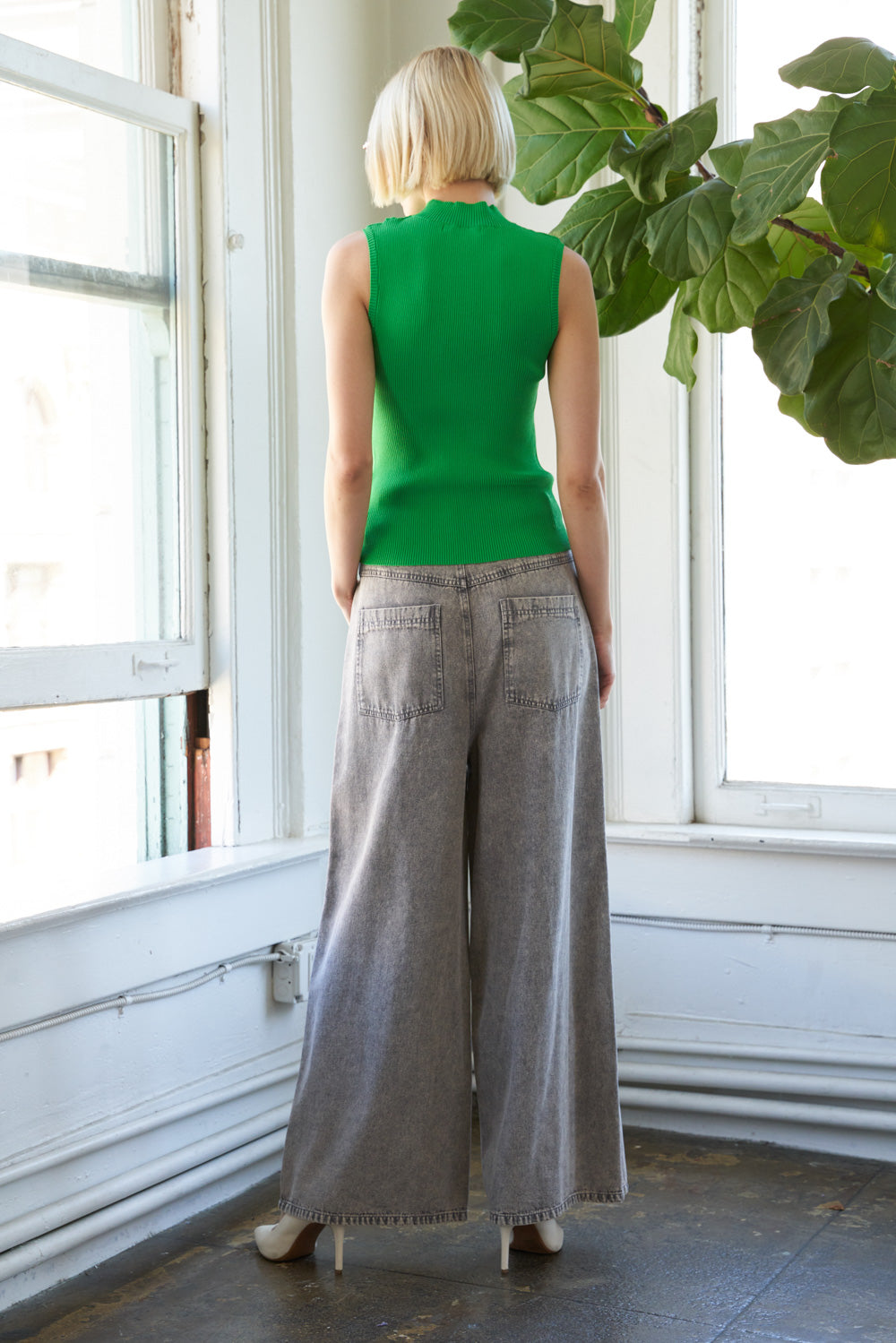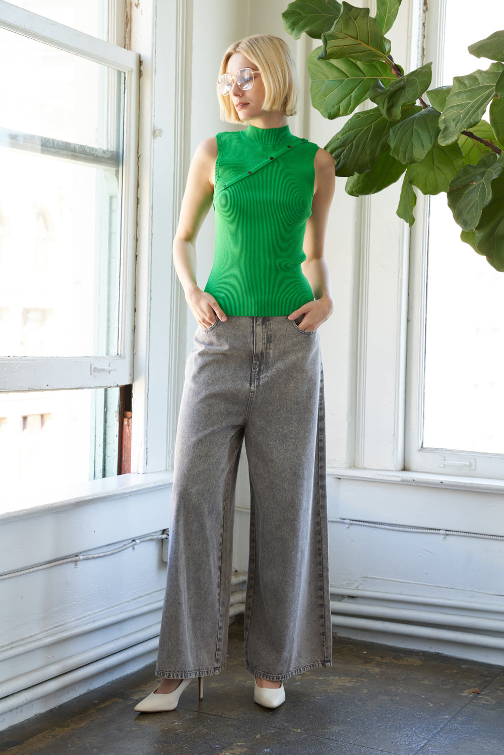 A knitted sweater knit top featuring mock neckline, sleeveless and diagonal opening with functional snap closure