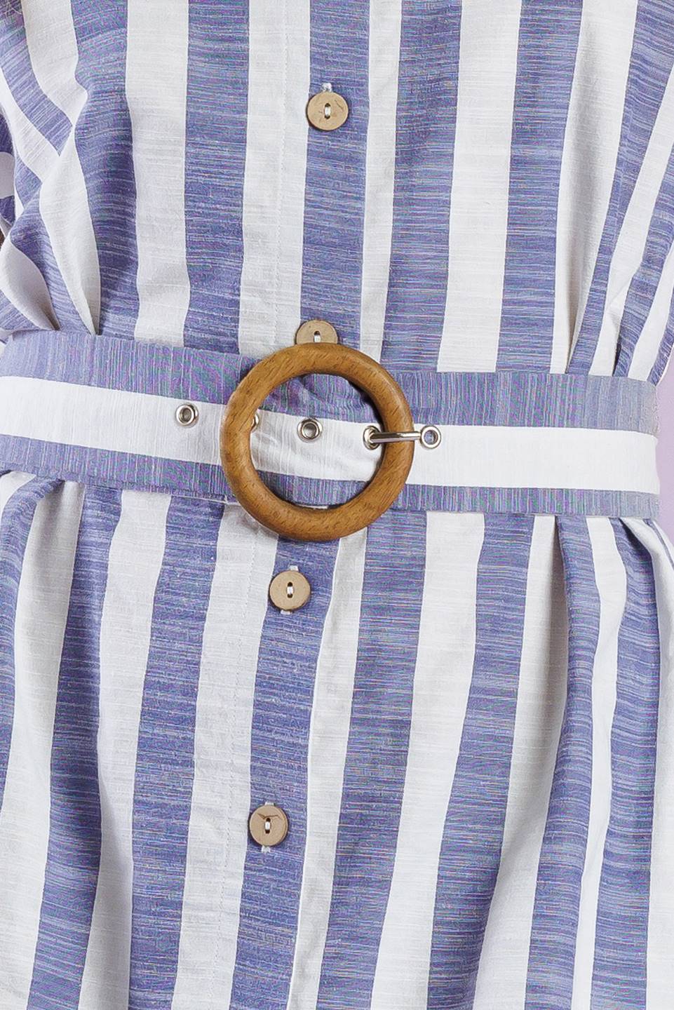 A vacay-ready woven midi dress with stripes, collar, button down, cuffed sleeves, a belted waist, and convenient side pockets.