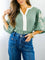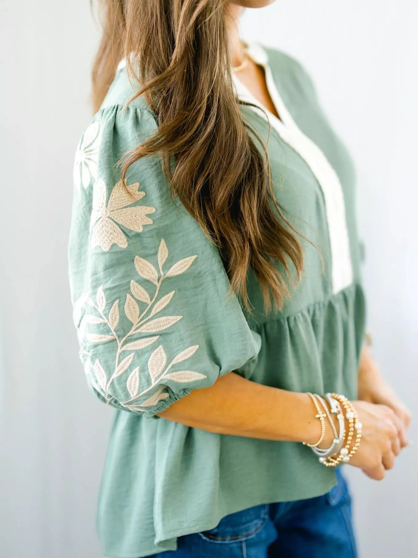 Color Block Patchwork V Neck Embroidered Puff Sleeve Babydoll Blouse