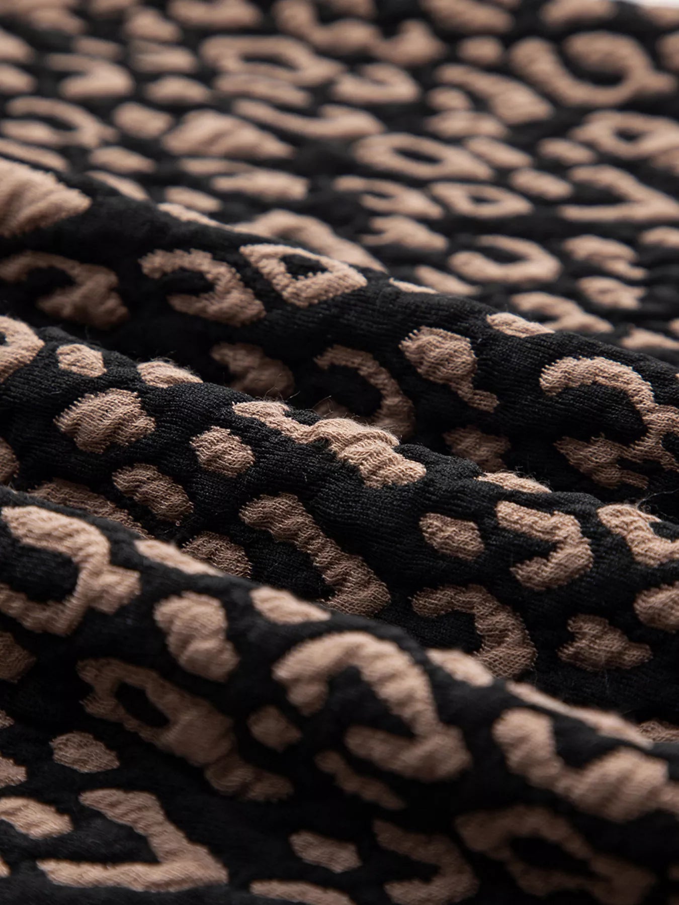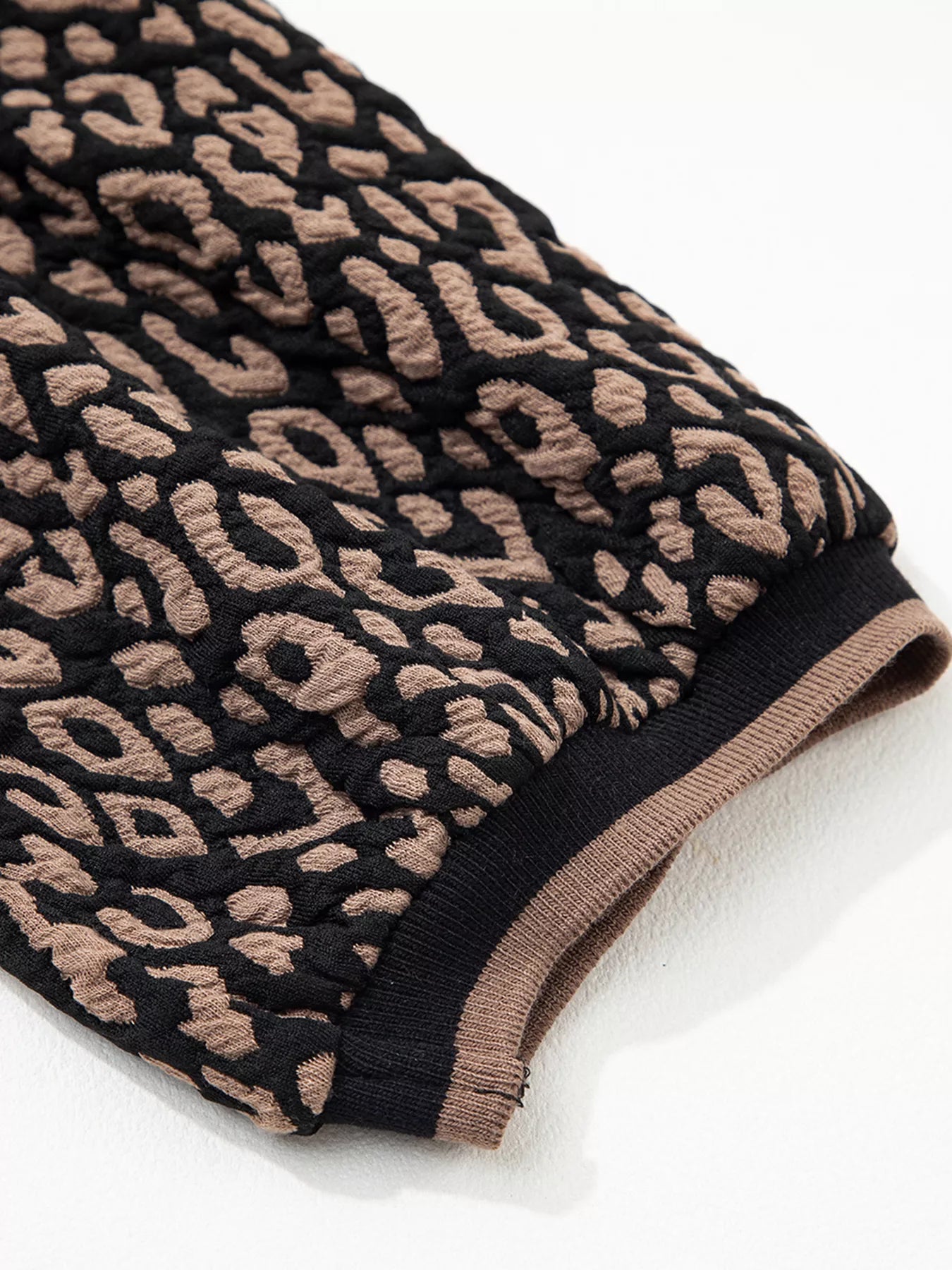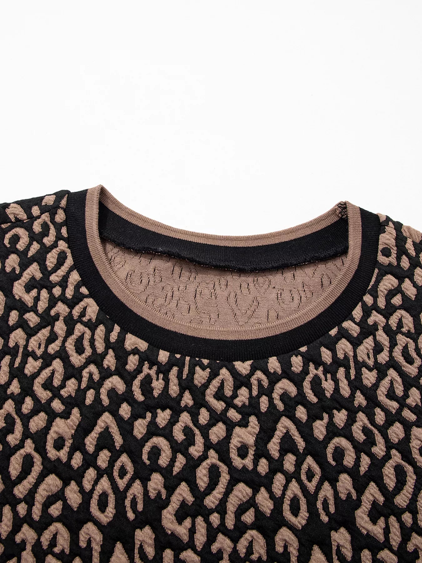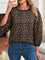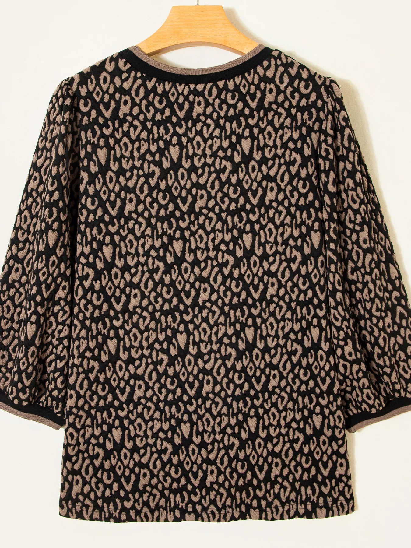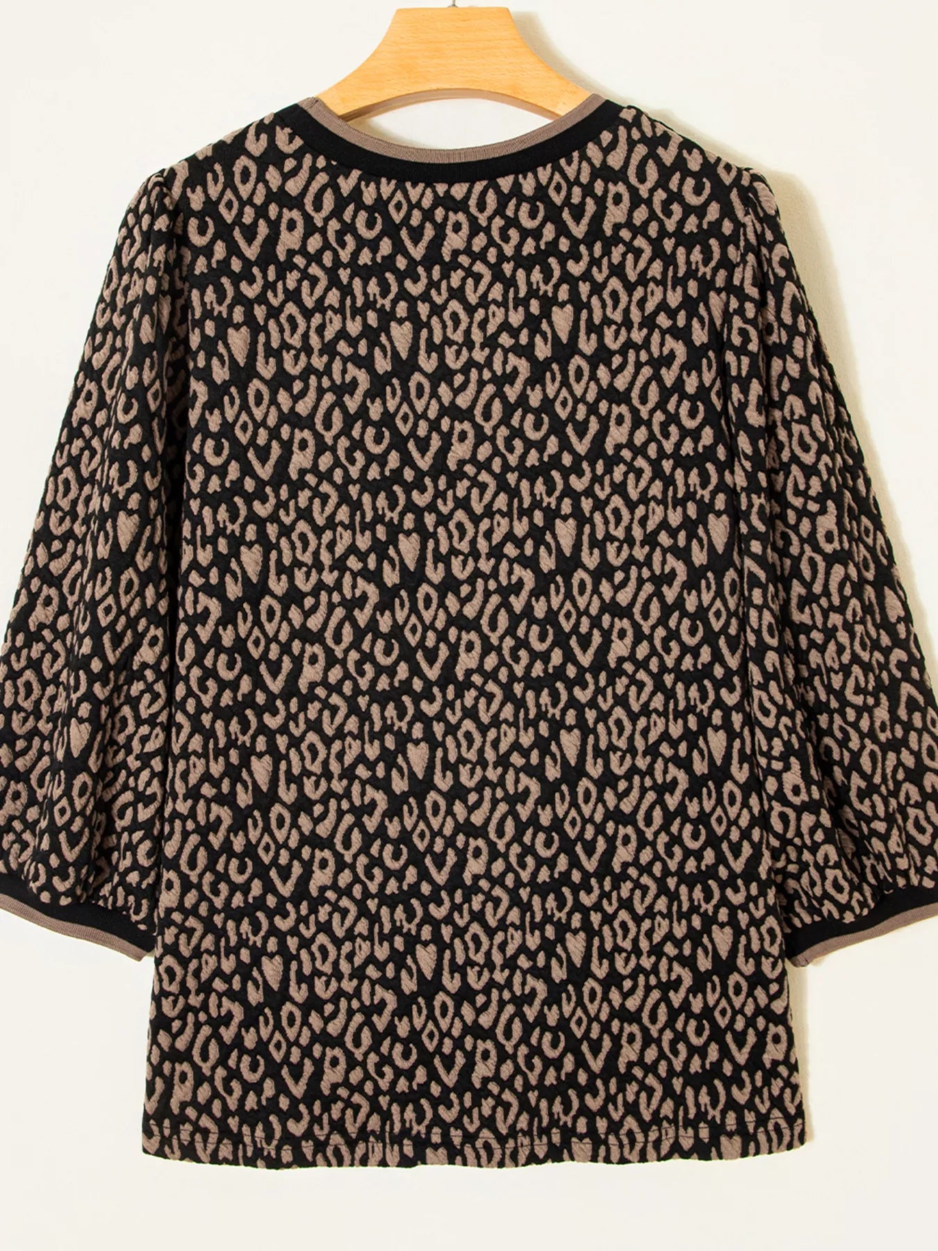 Leopard Print Puffy Bracelet Sleeve Contrast Trim Round Neck Top