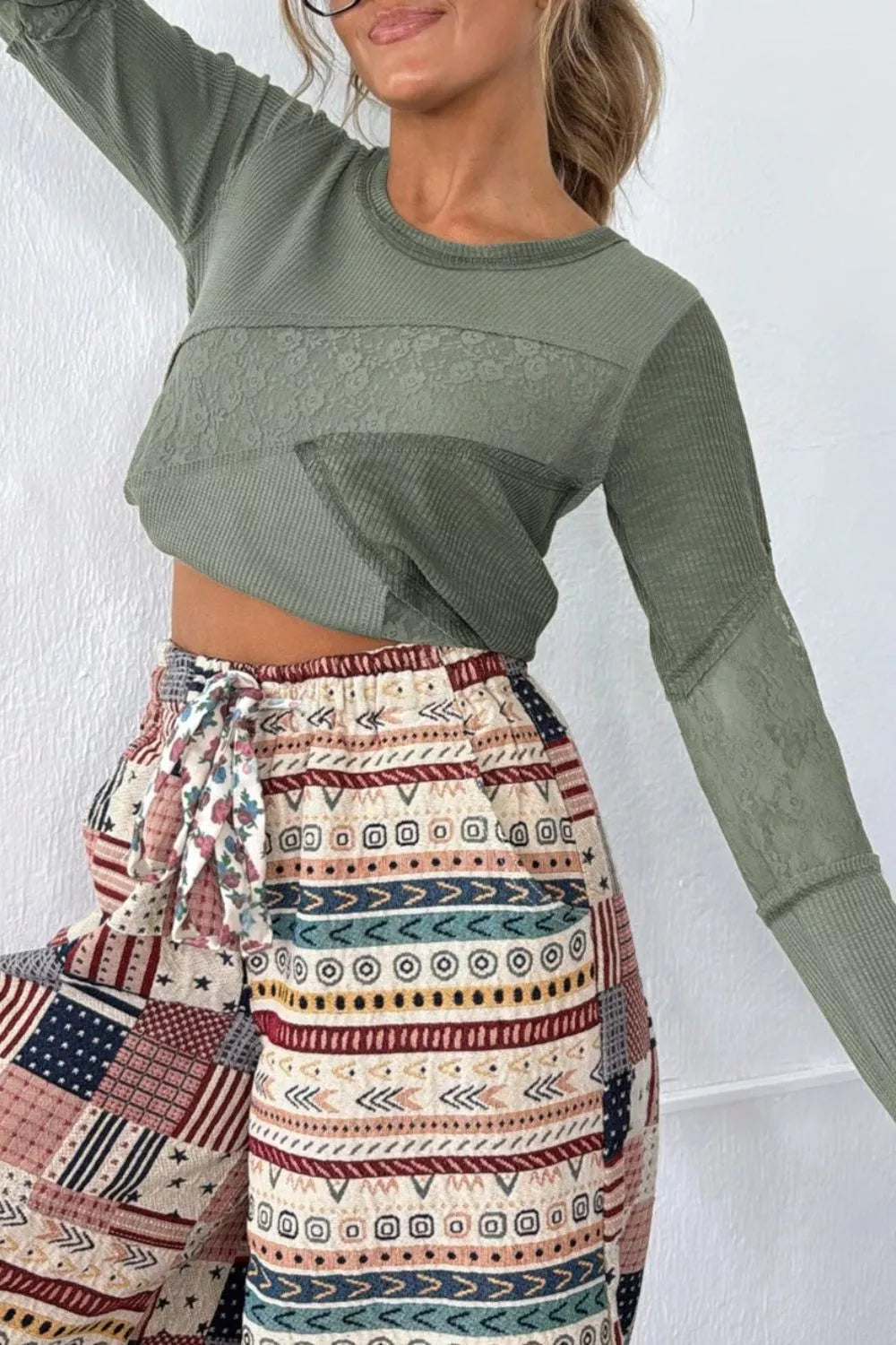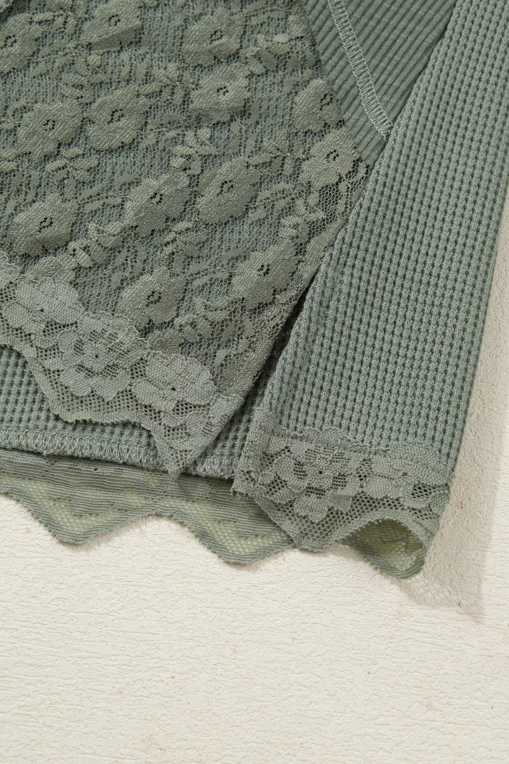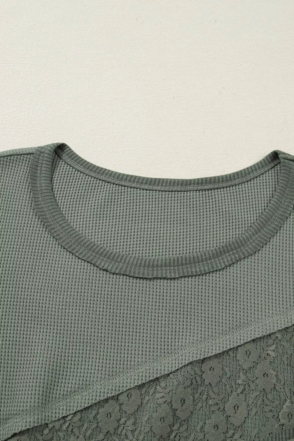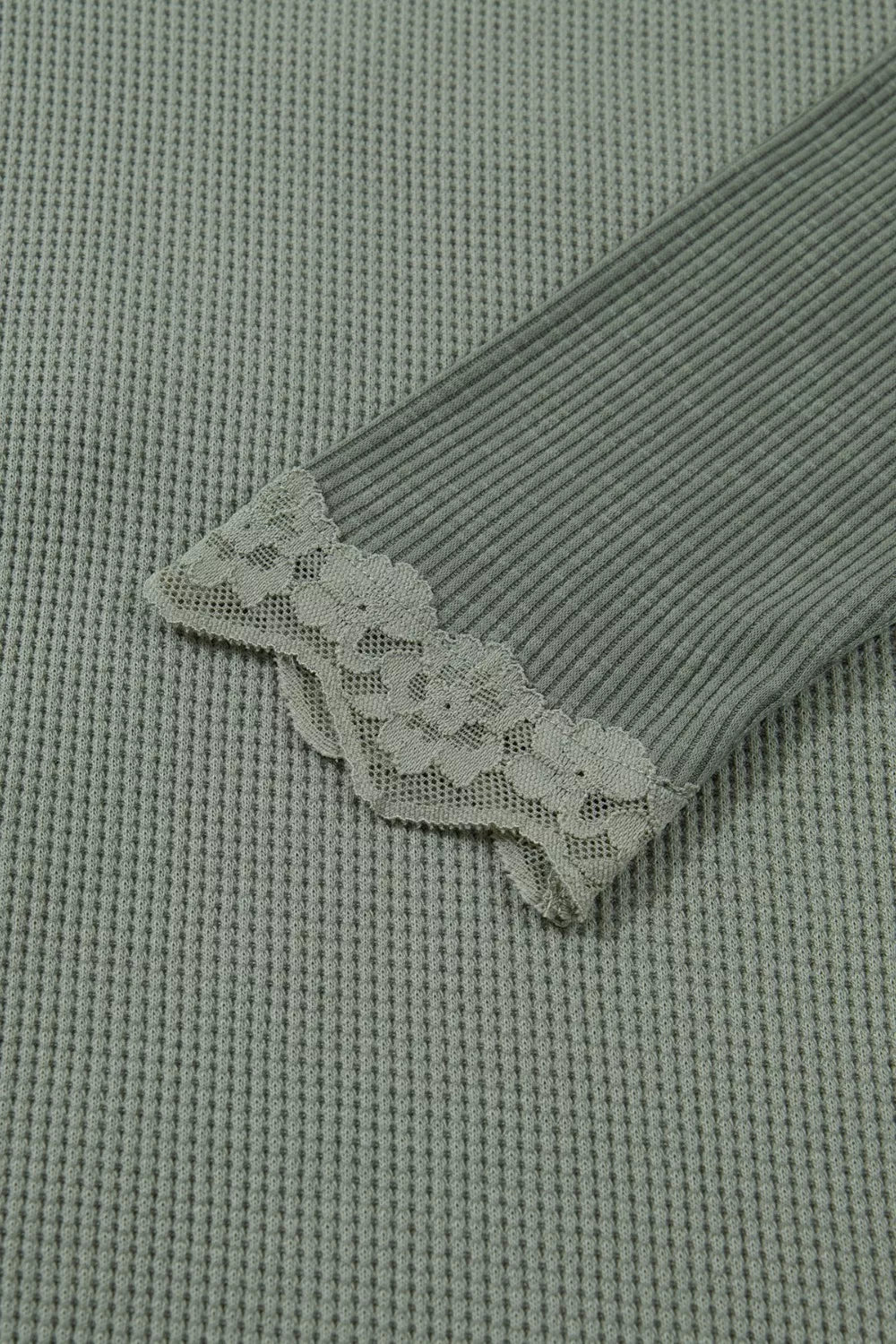 Solid Color Waffle Ribbed Lace Patchwork Long Sleeve Top