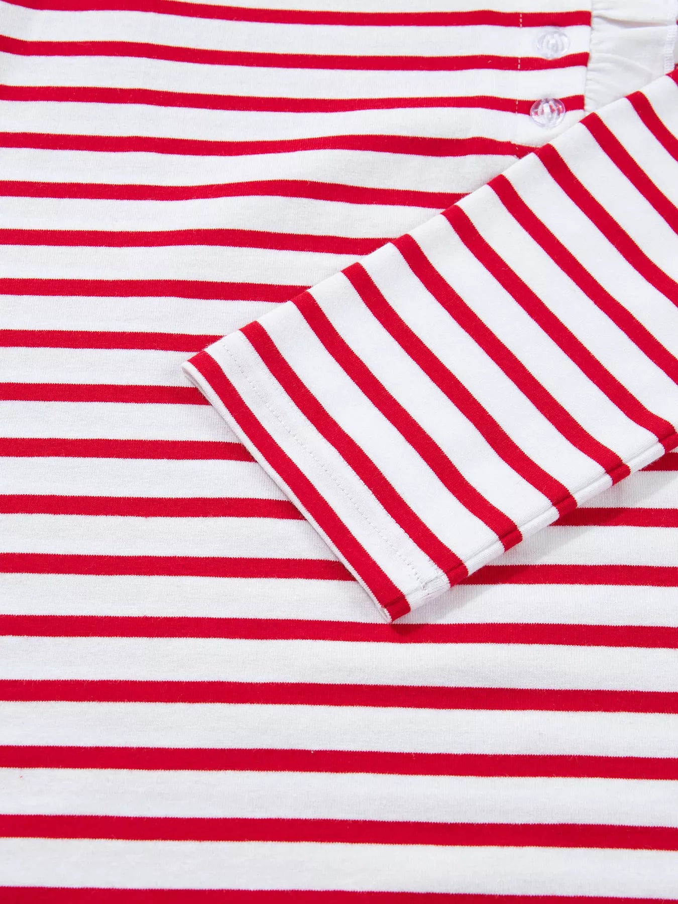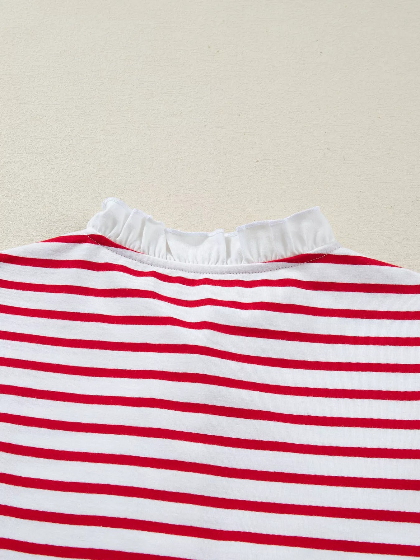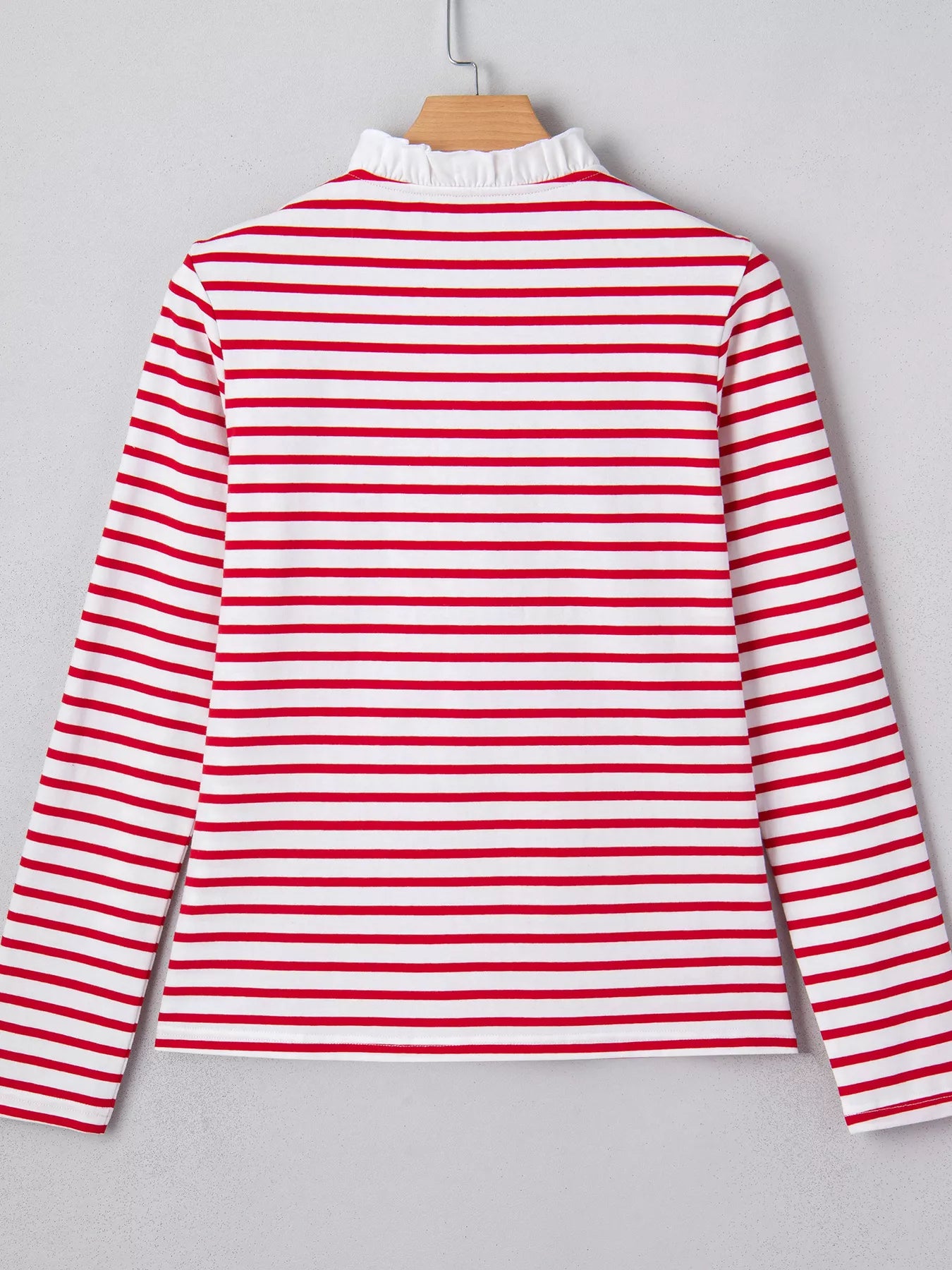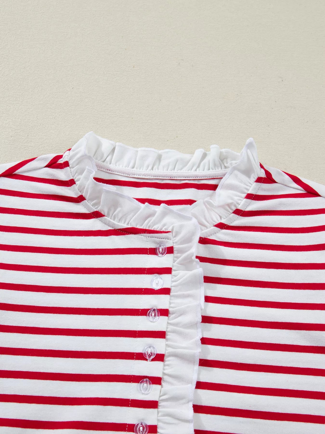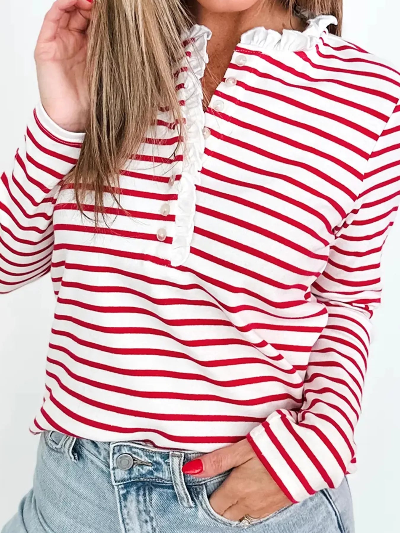 Stripe Contrast Frilled Trim Half Button Long Sleeve Top