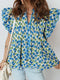 Umgee Puff Sleeve Zip Front Top with Contrast Striped Trim