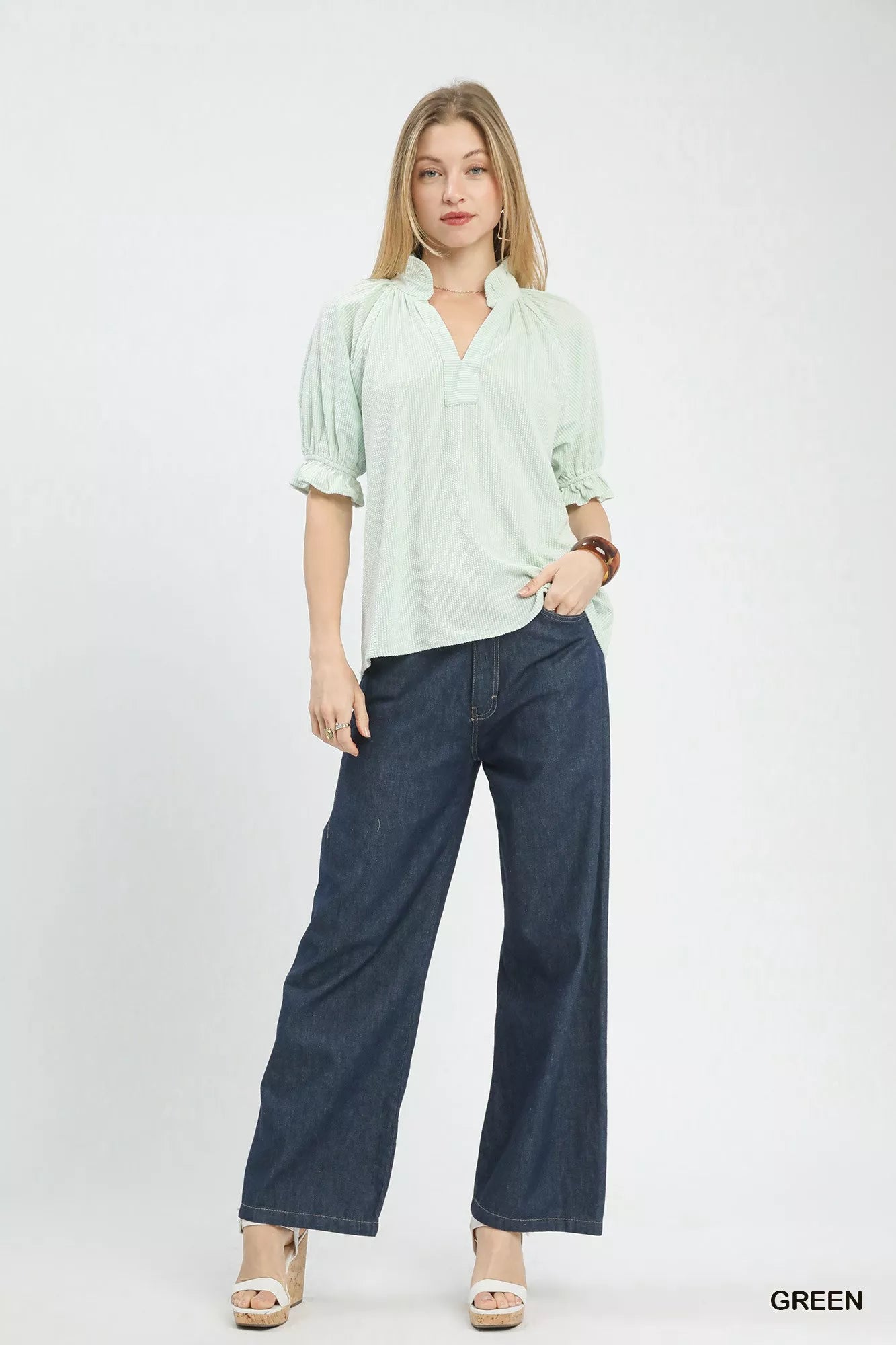 Umgee Textured Ruffle Sleeve V-Neck Top