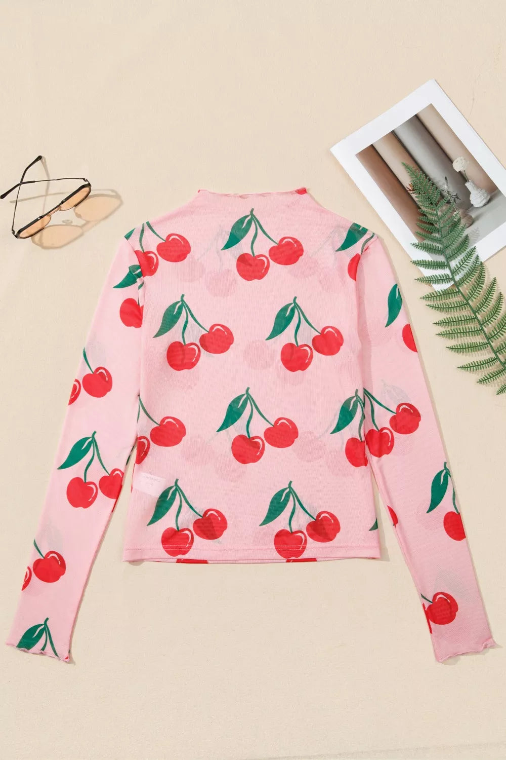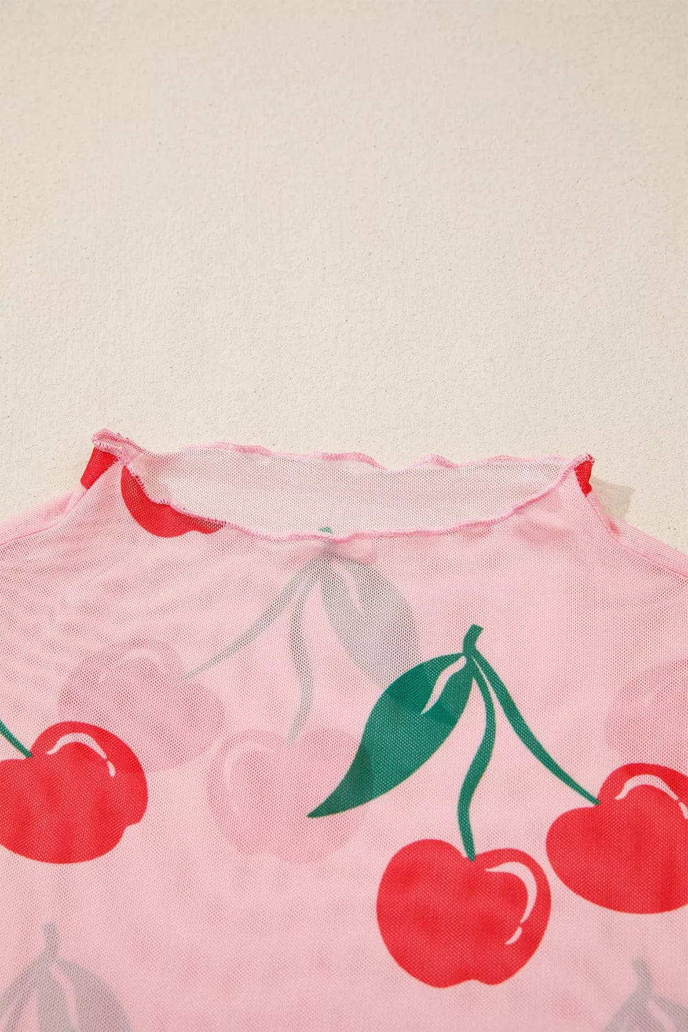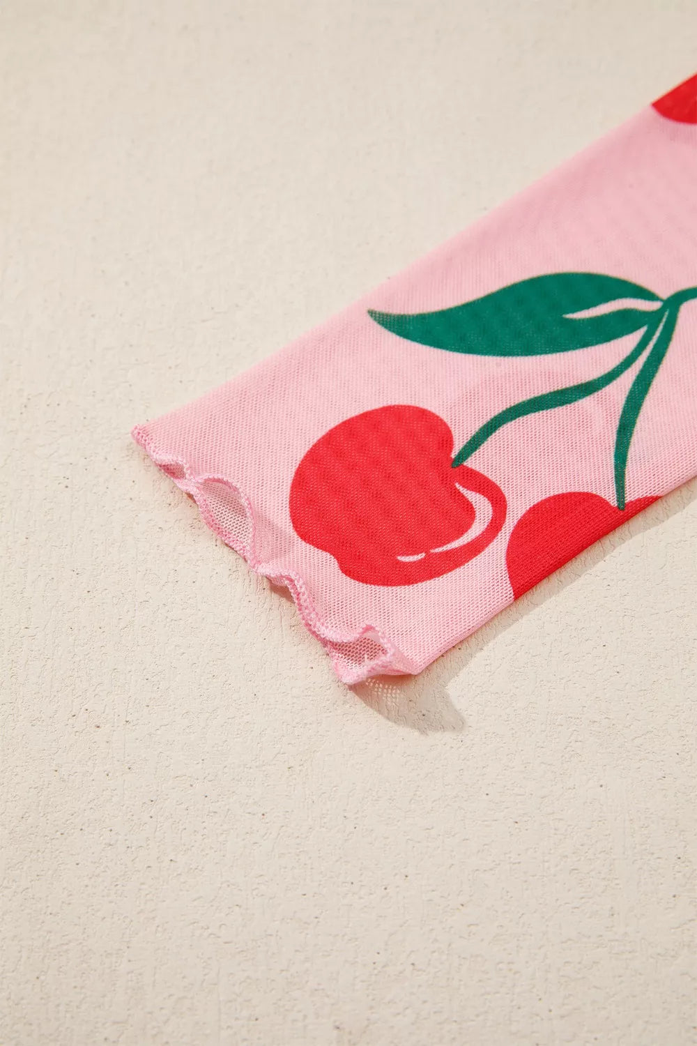 Cherry Print Lettuce Trim Long Sleeve Mesh Top