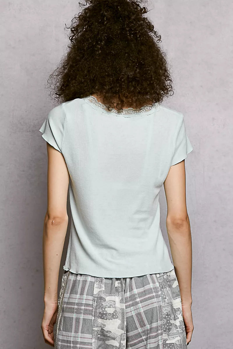 The round-neck short-sleeve ribbed basic top offers a regular fit and delicate lace detailing along the neckline for a touch of femininity. The soft merrow edging adds a subtle finishing touch to the design. Finished in a solid color with a clean, normal wash, this top exudes simplicity and elegance, perfect for an everyday look. Ideal for both casual and dressed-up occasions, this top combines comfort with style for a versatile wardrobe staple.