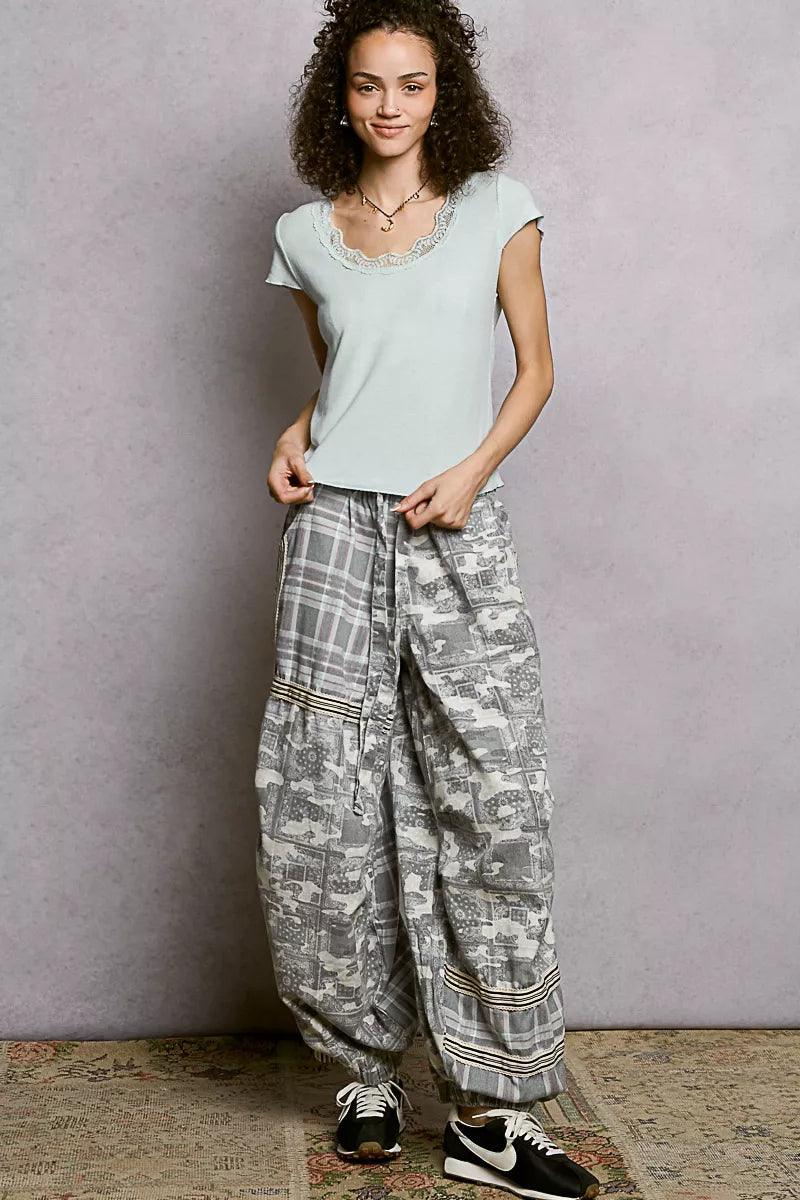 POL Round Neck Short Sleeve Crop T-Shirt with Lace Trim