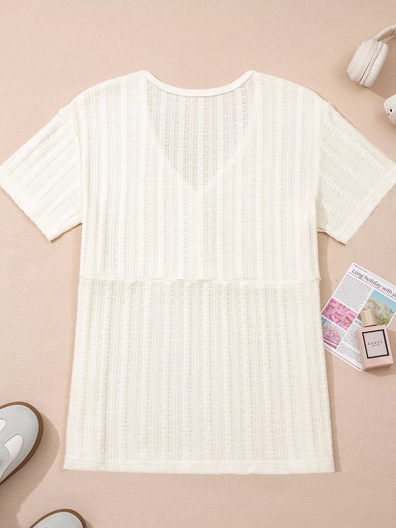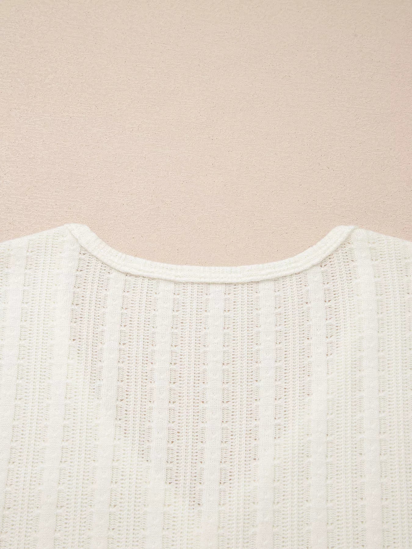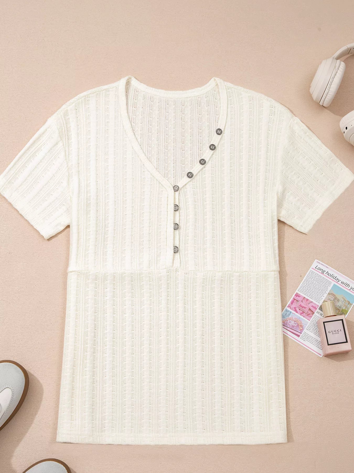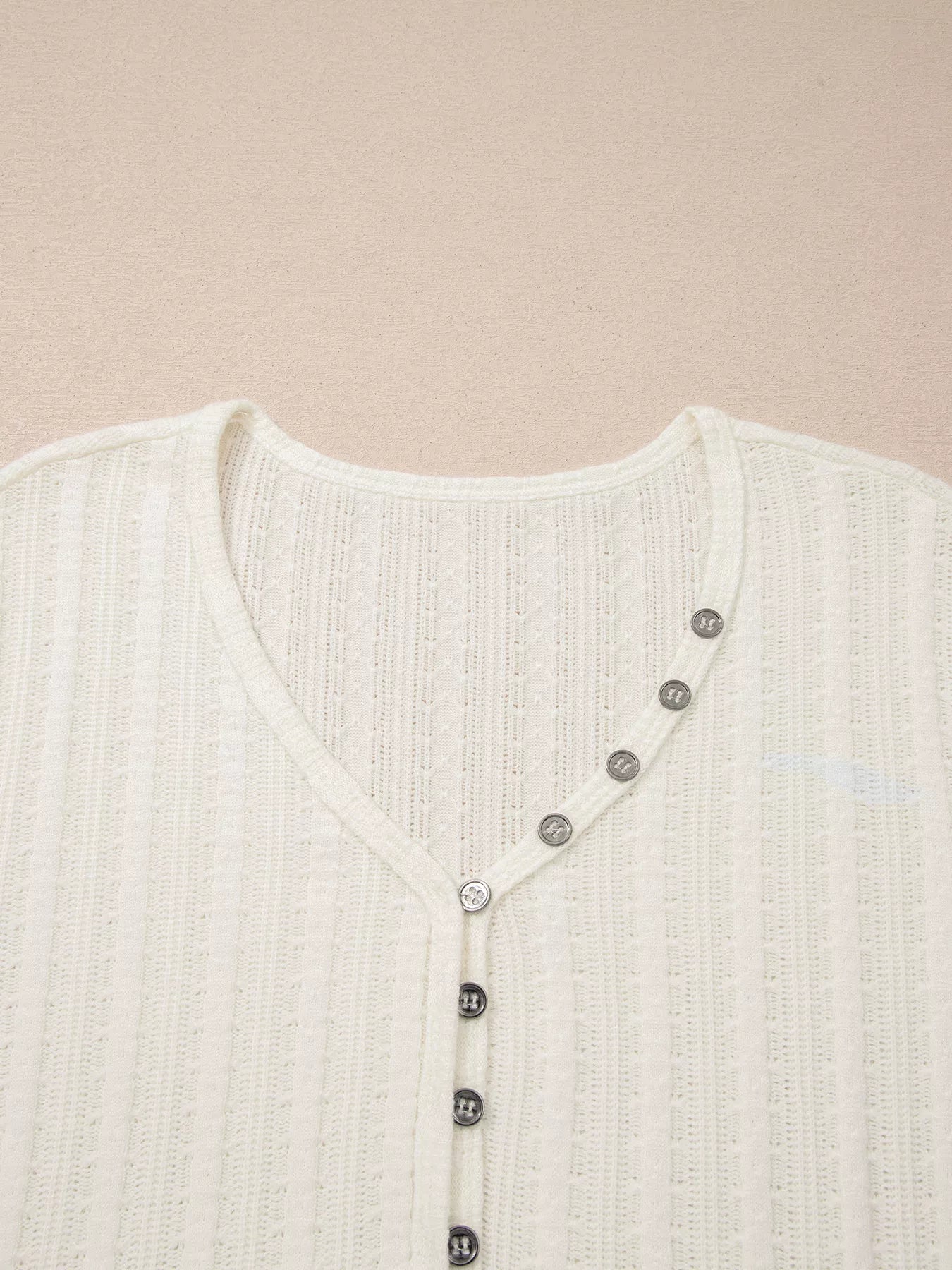 Solid Color Textured Button V Neck Raw Seam Henley Tee
