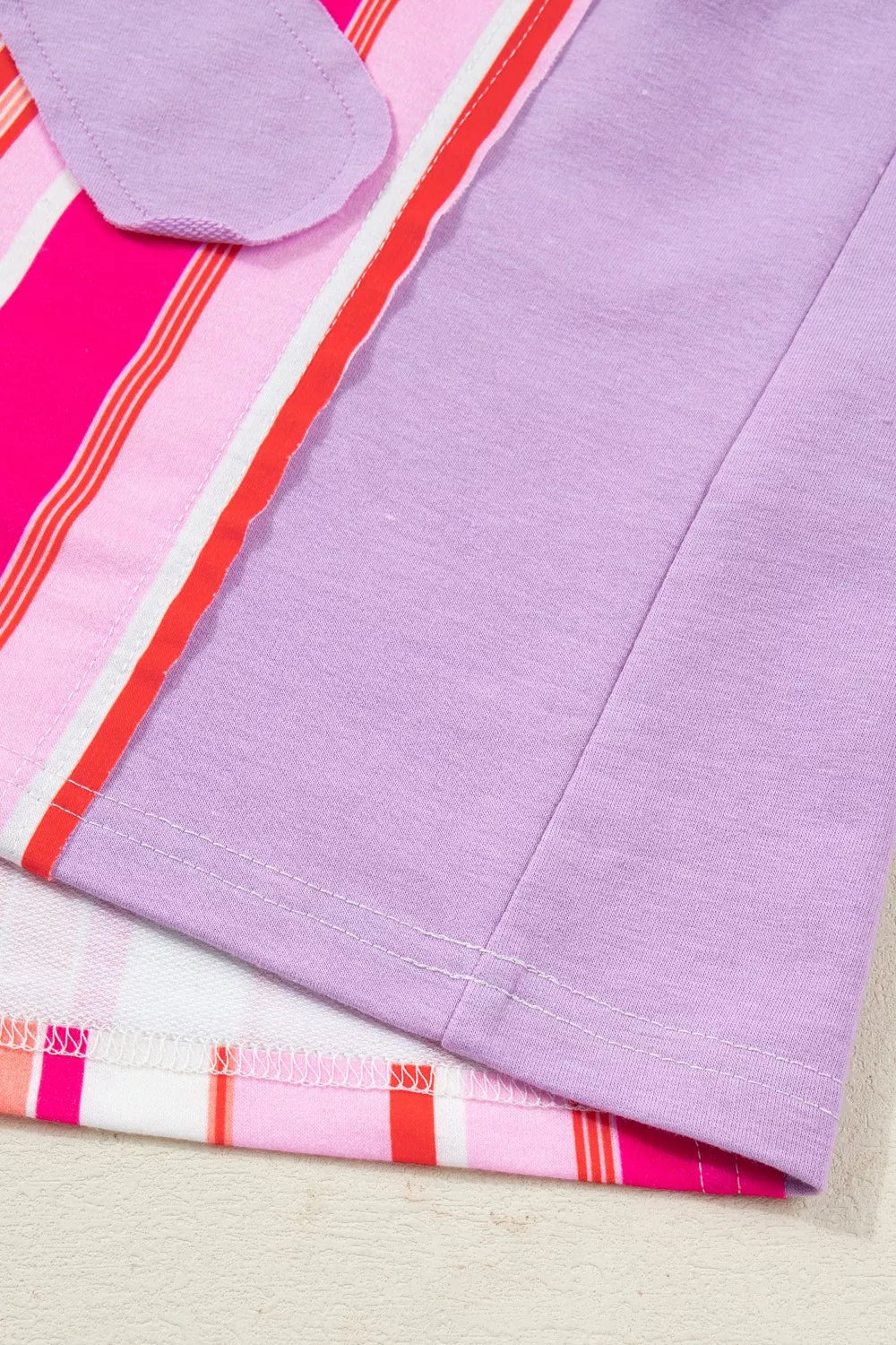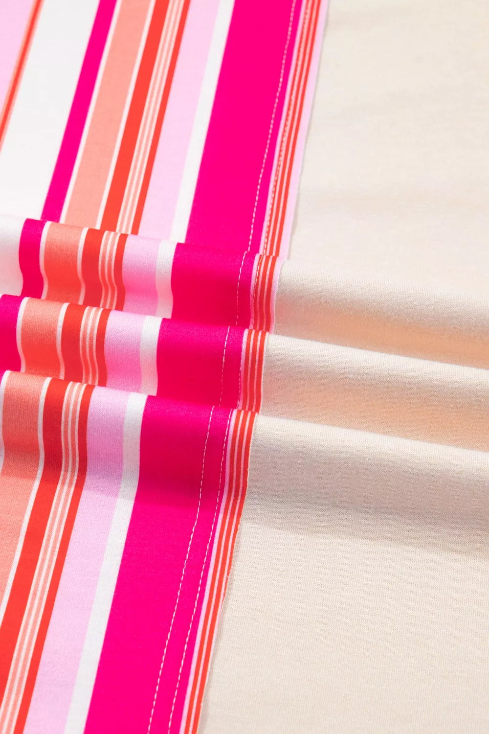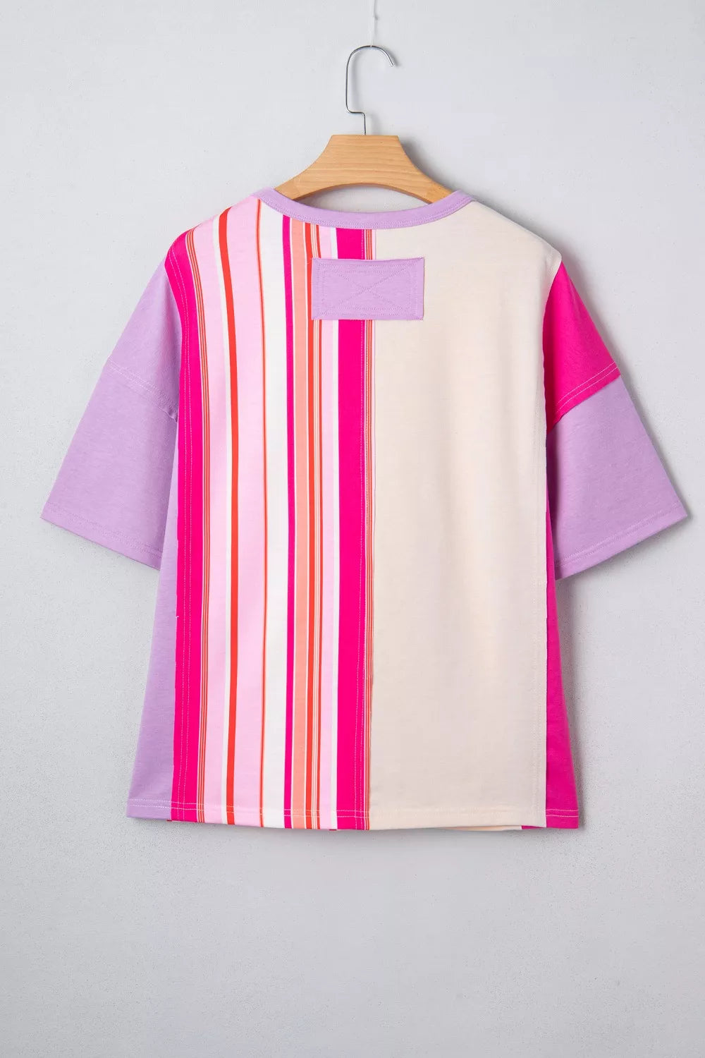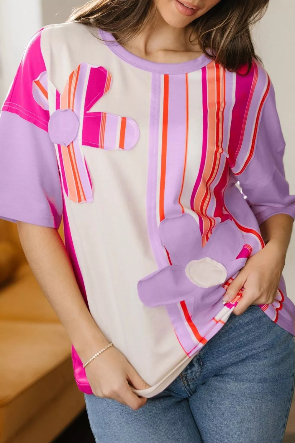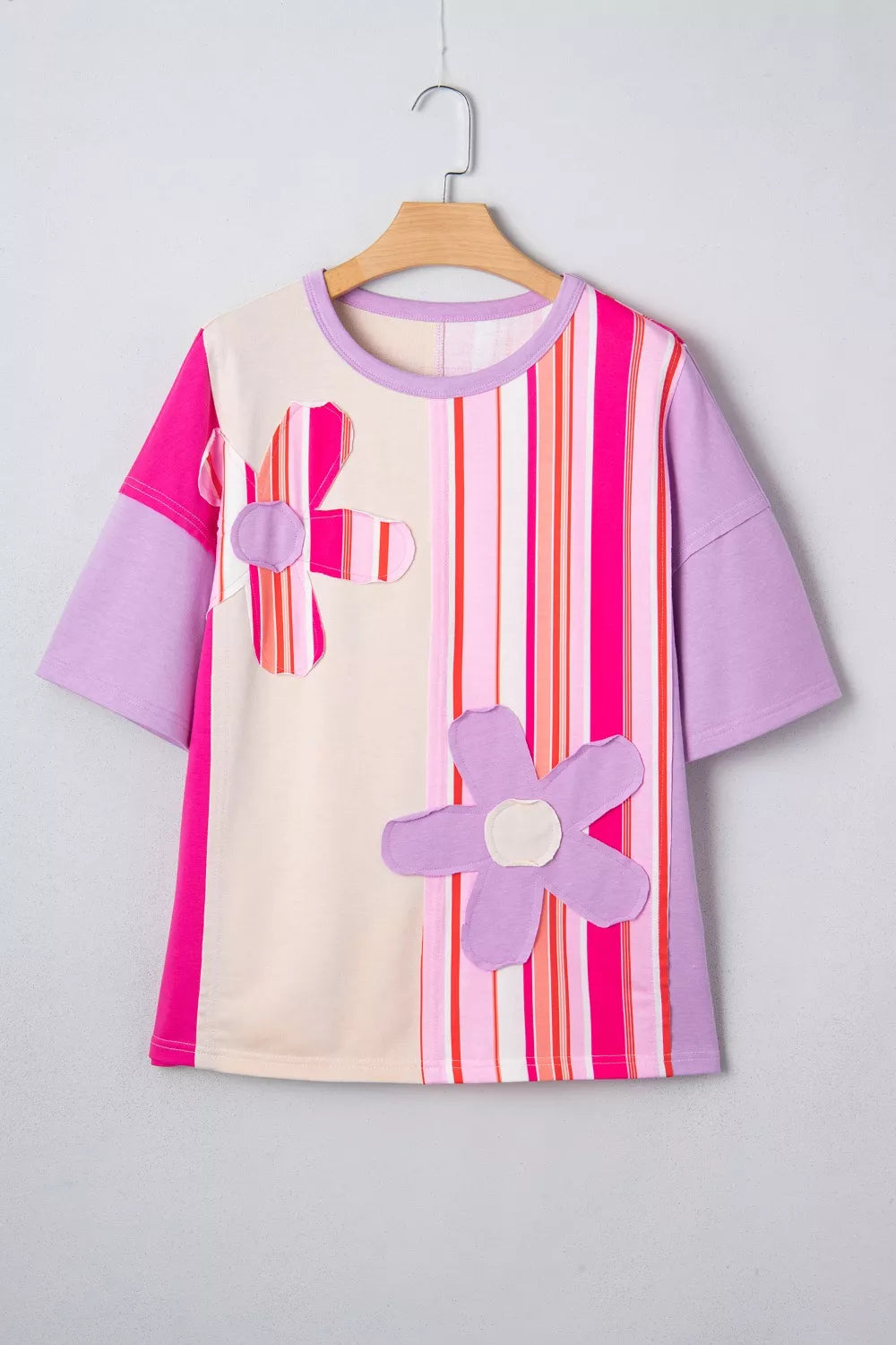 Striped Color Block Flower Patched Half Sleeve Loose Top