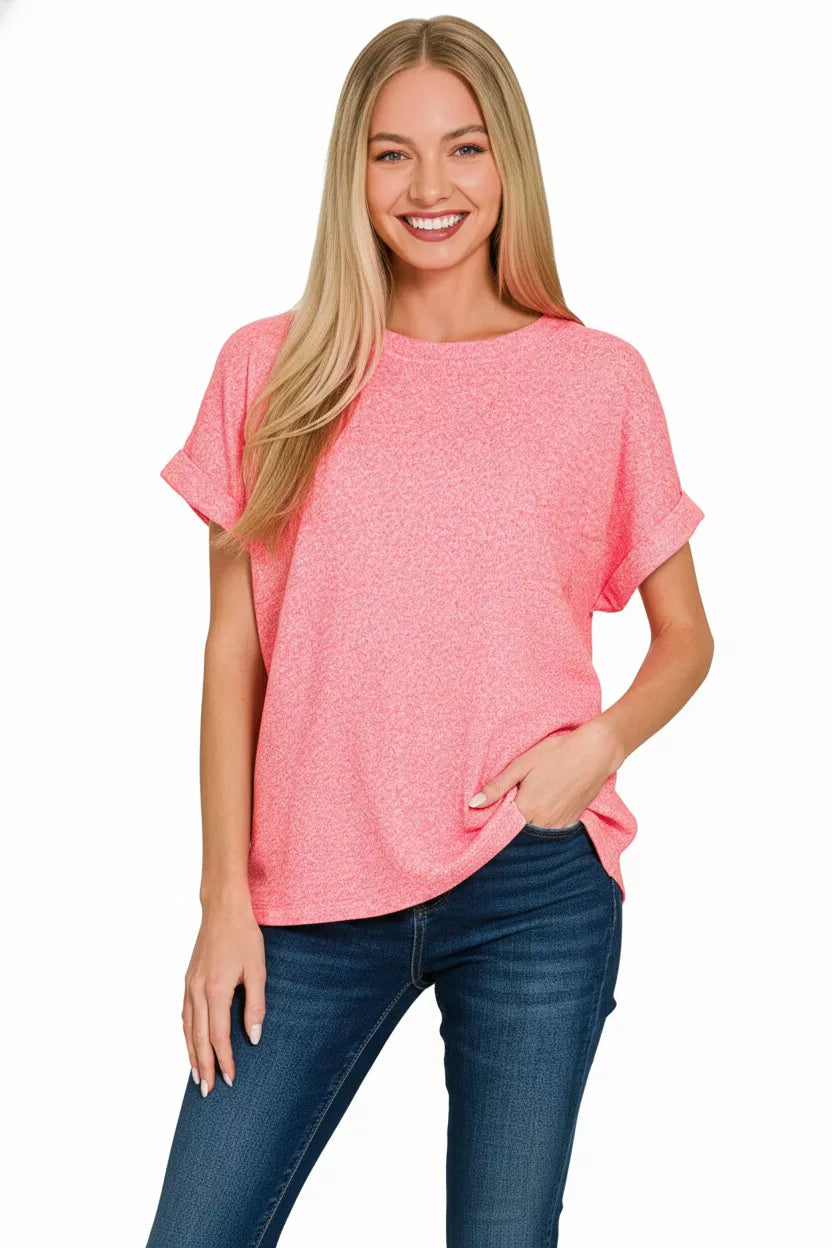 Zenana Soft Melange Hacci Short Sleeve Round Neck Top