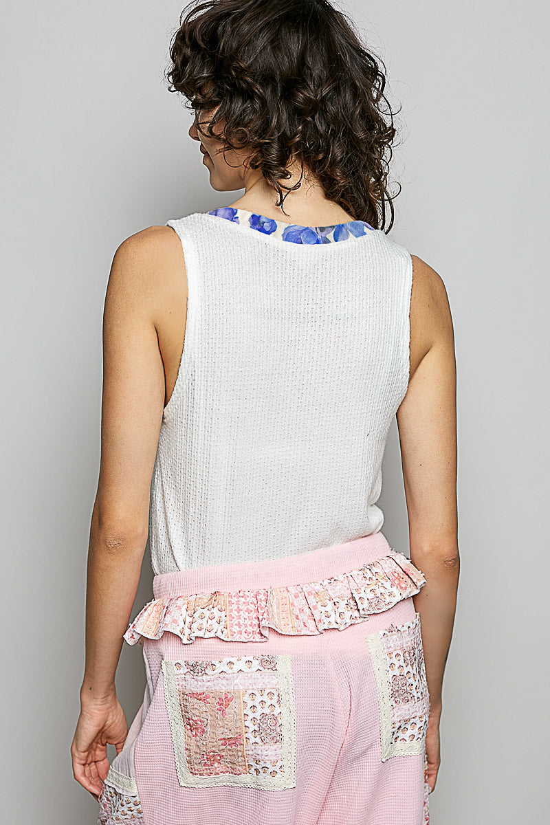 POL Ribbed V-Neck Tank with Contrast Floral Neckband