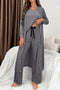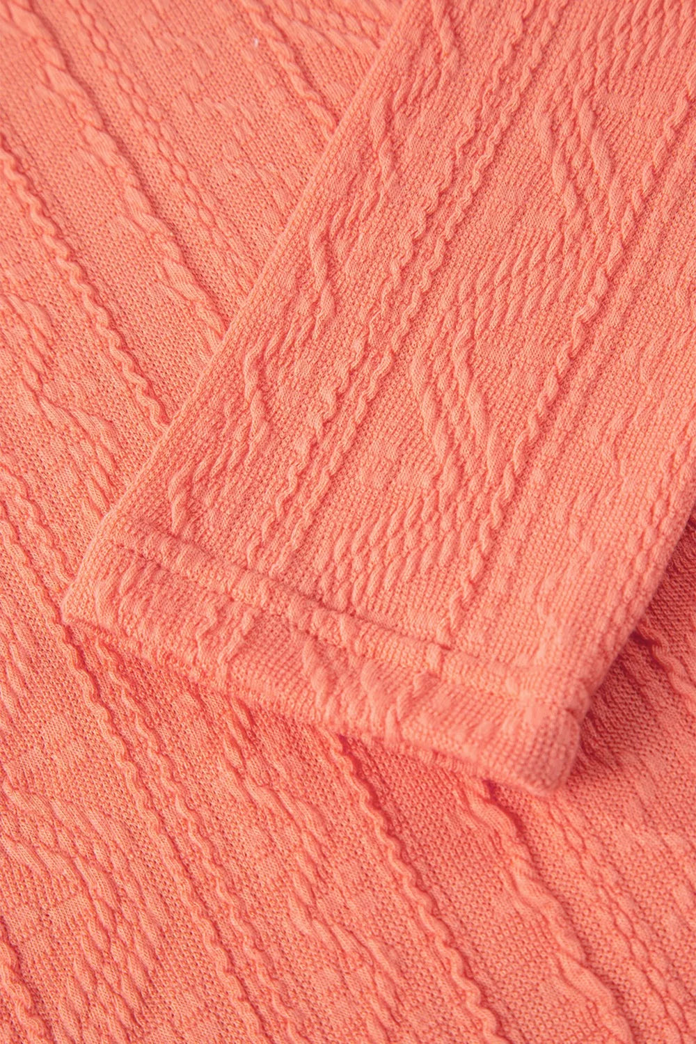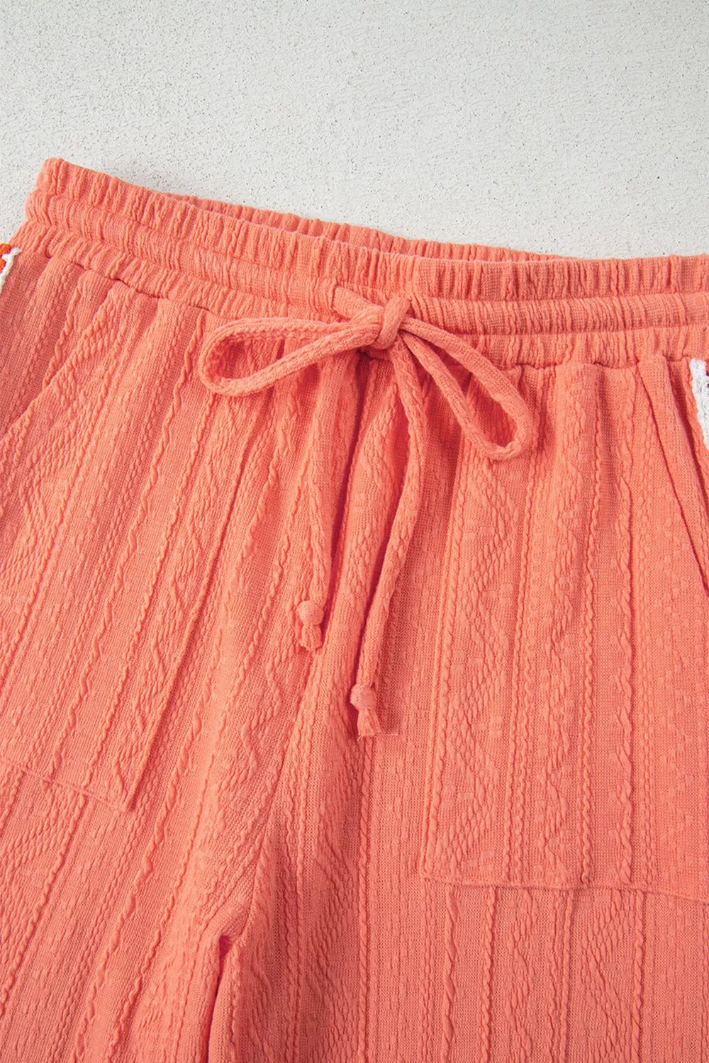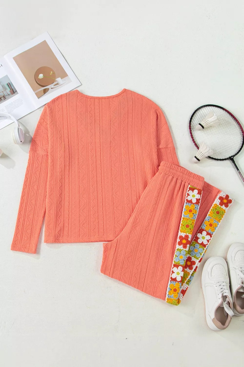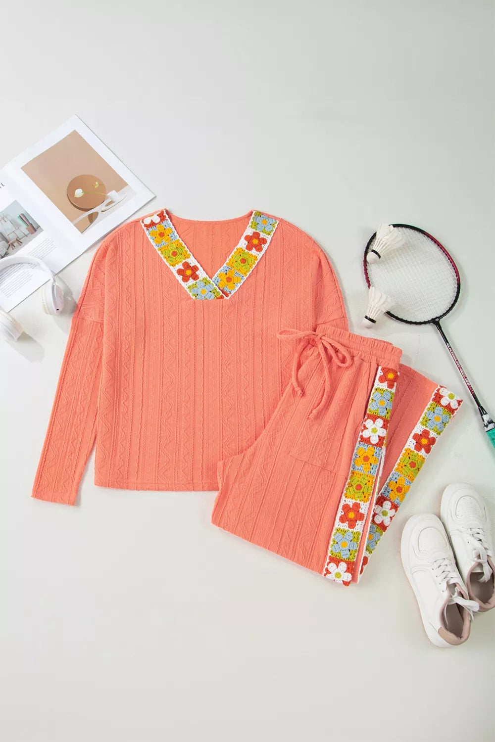Crochet Floral Accent V Neck Textured Top and Pants Set