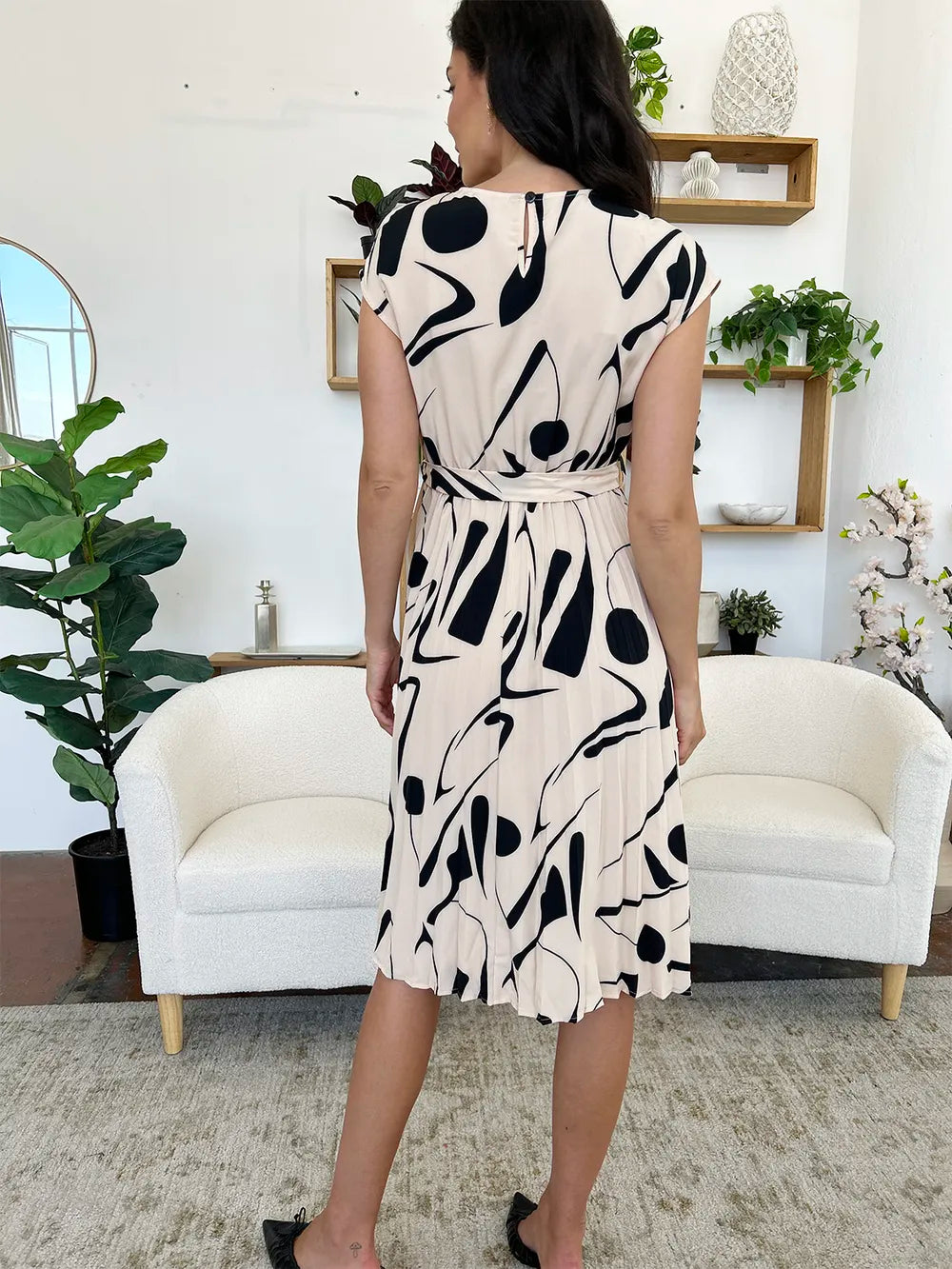 Perfee Tied Pleated Printed Cap Sleeve Dress