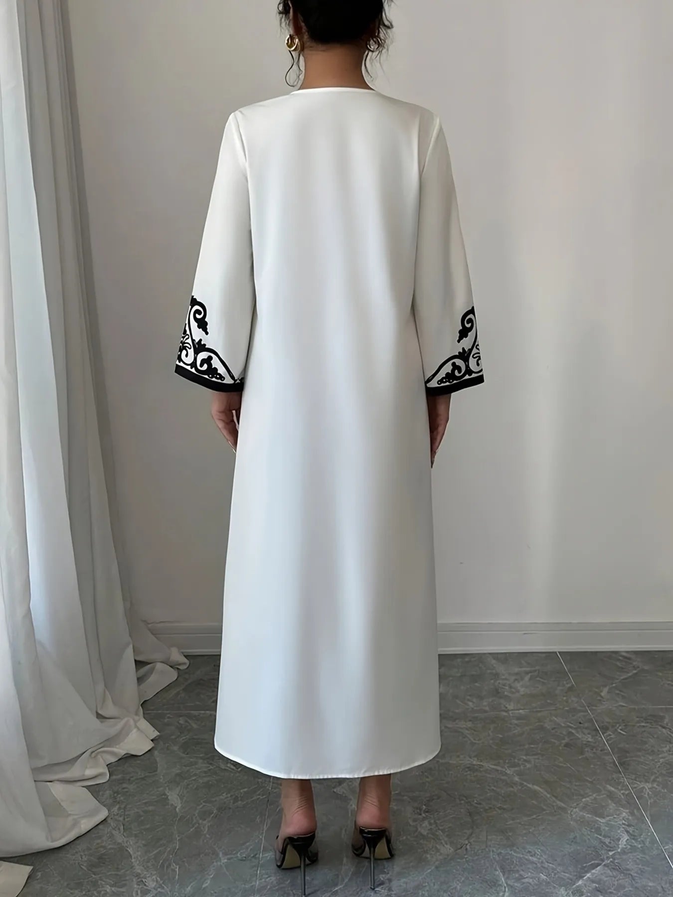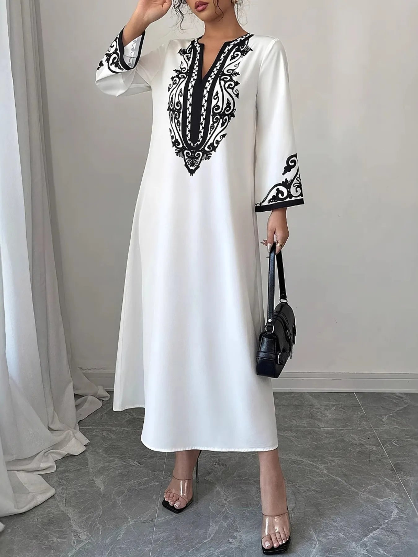 Printed Notched Long Sleeve Midi Dress