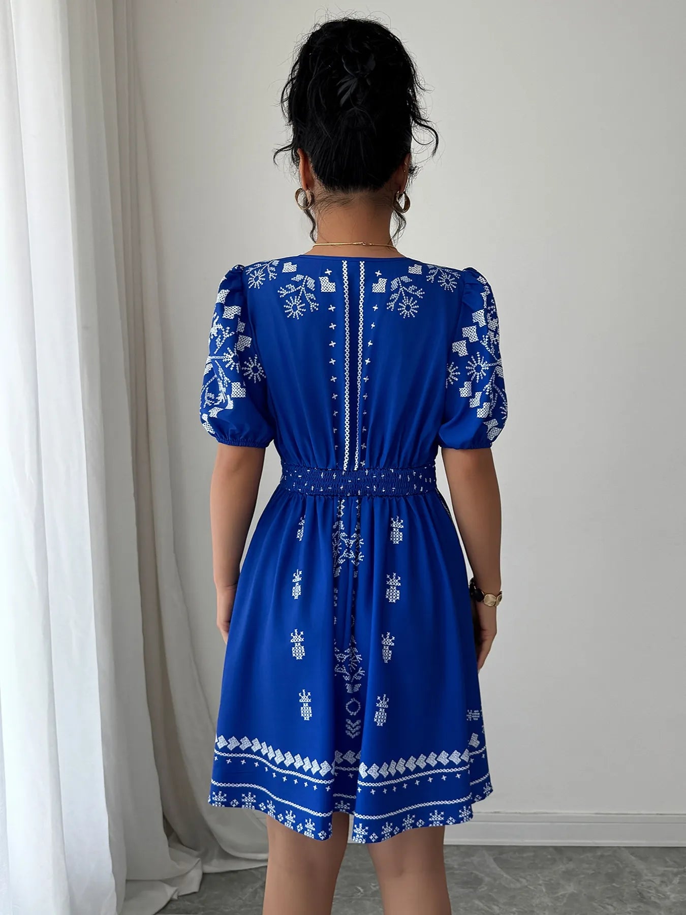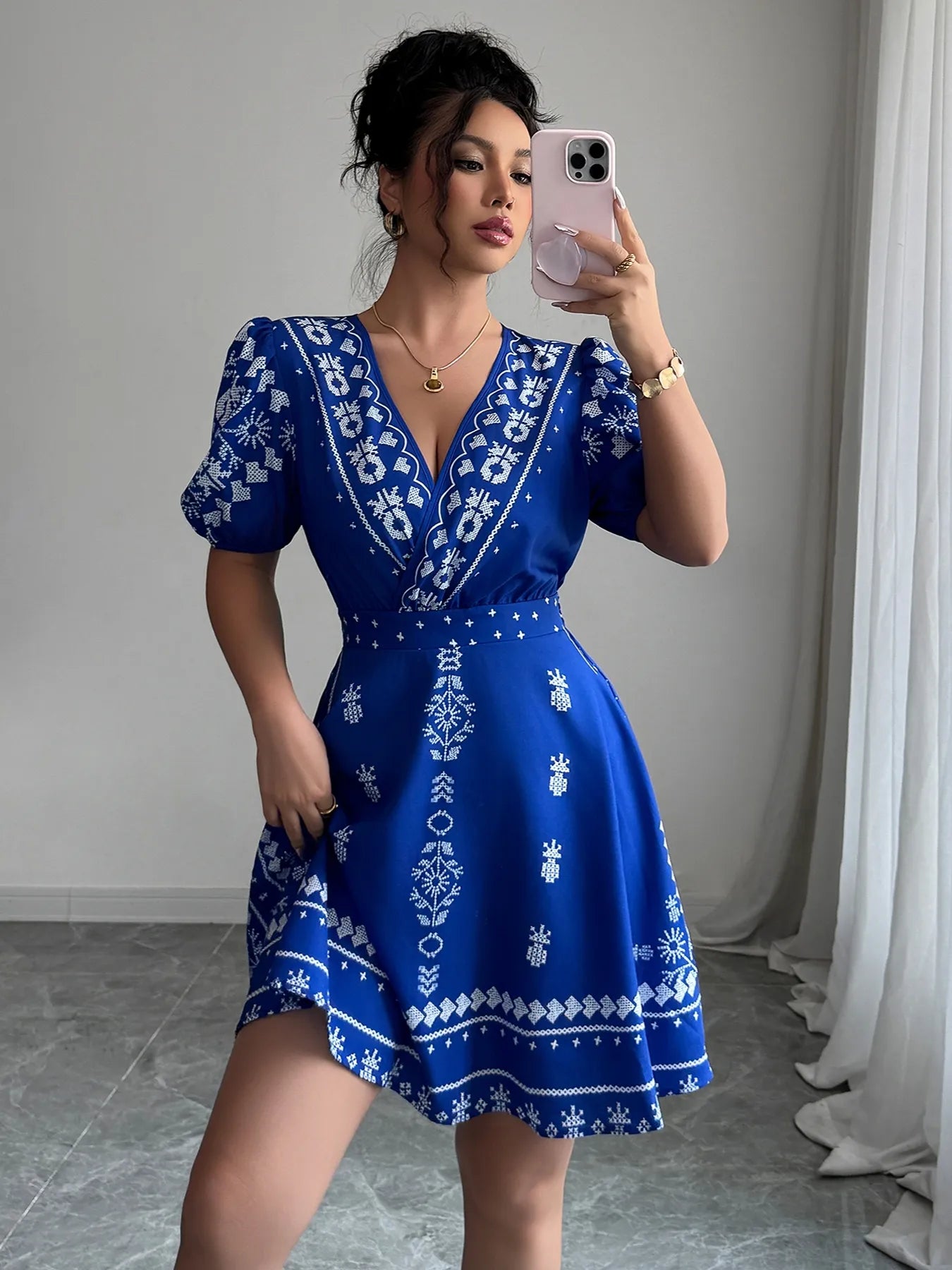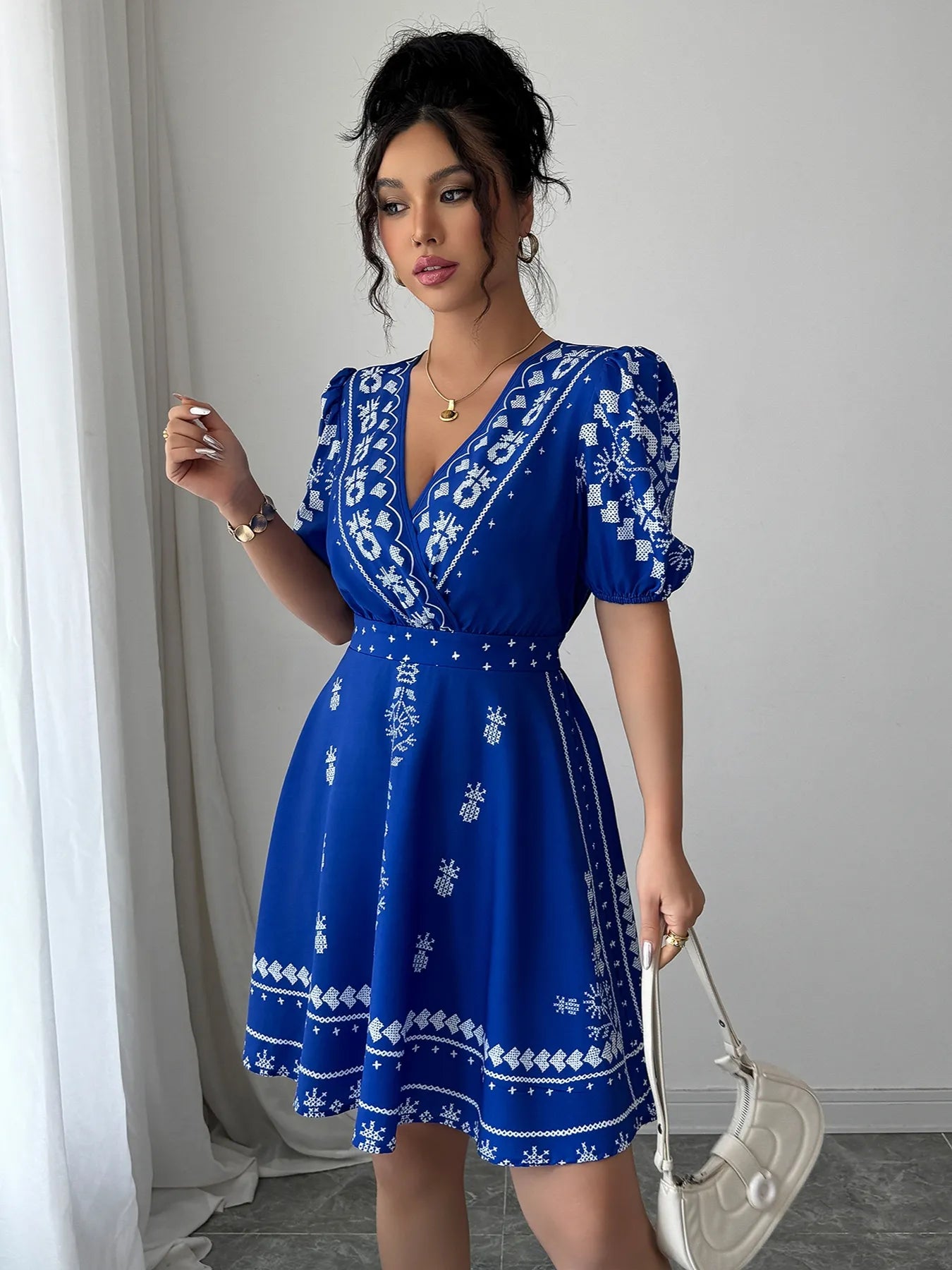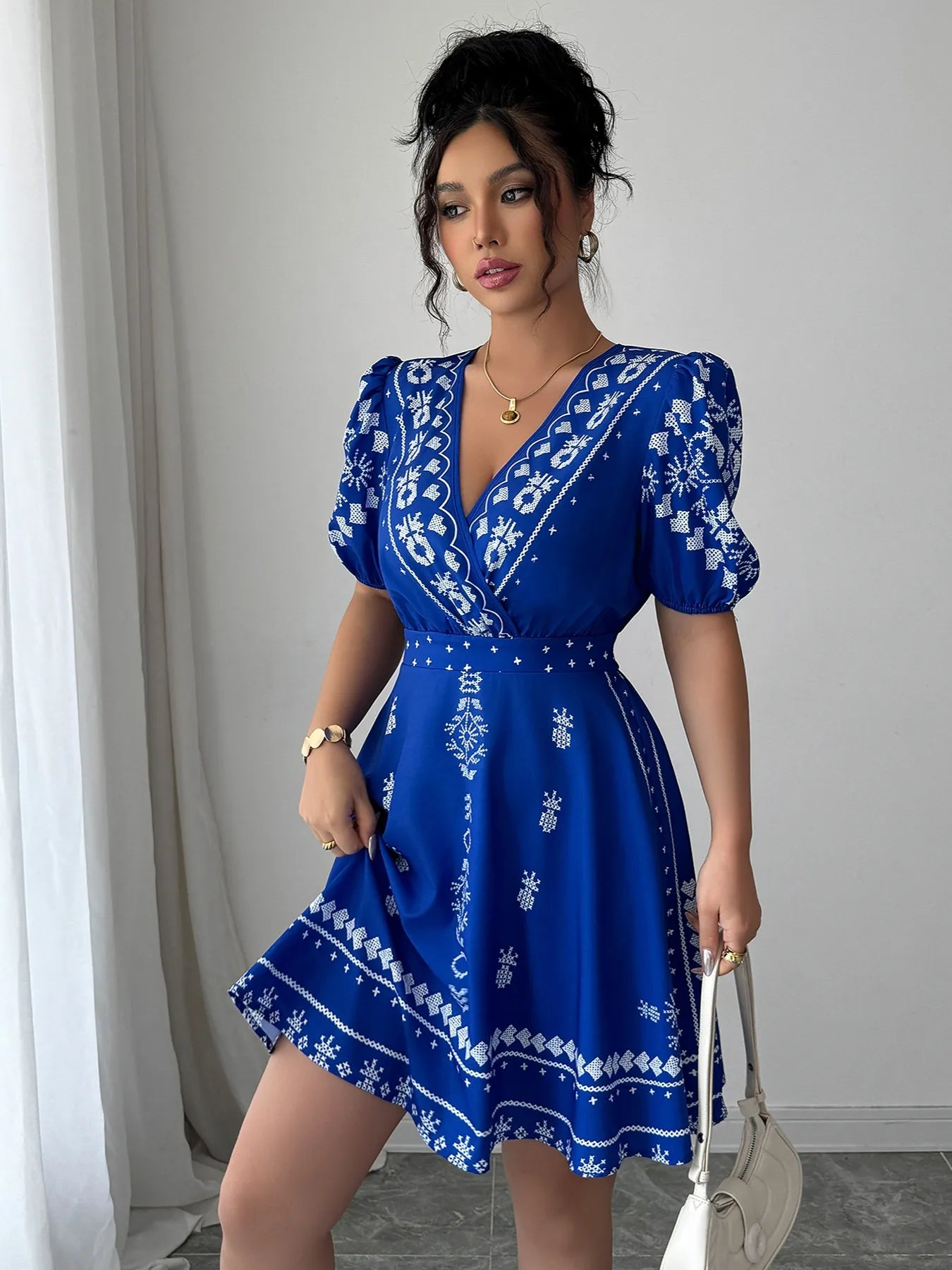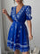 Printed Surplice Puff Sleeve Mini Dress