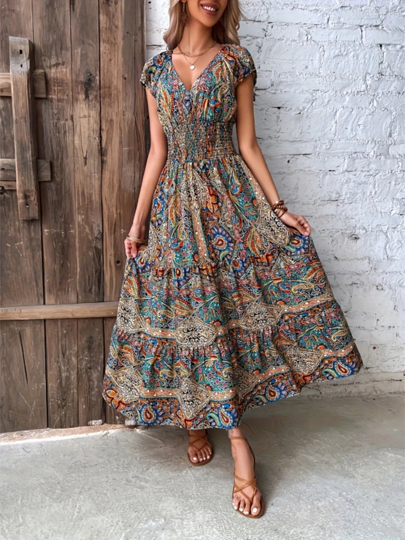 Printed V-Neck Cap Sleeve Dress