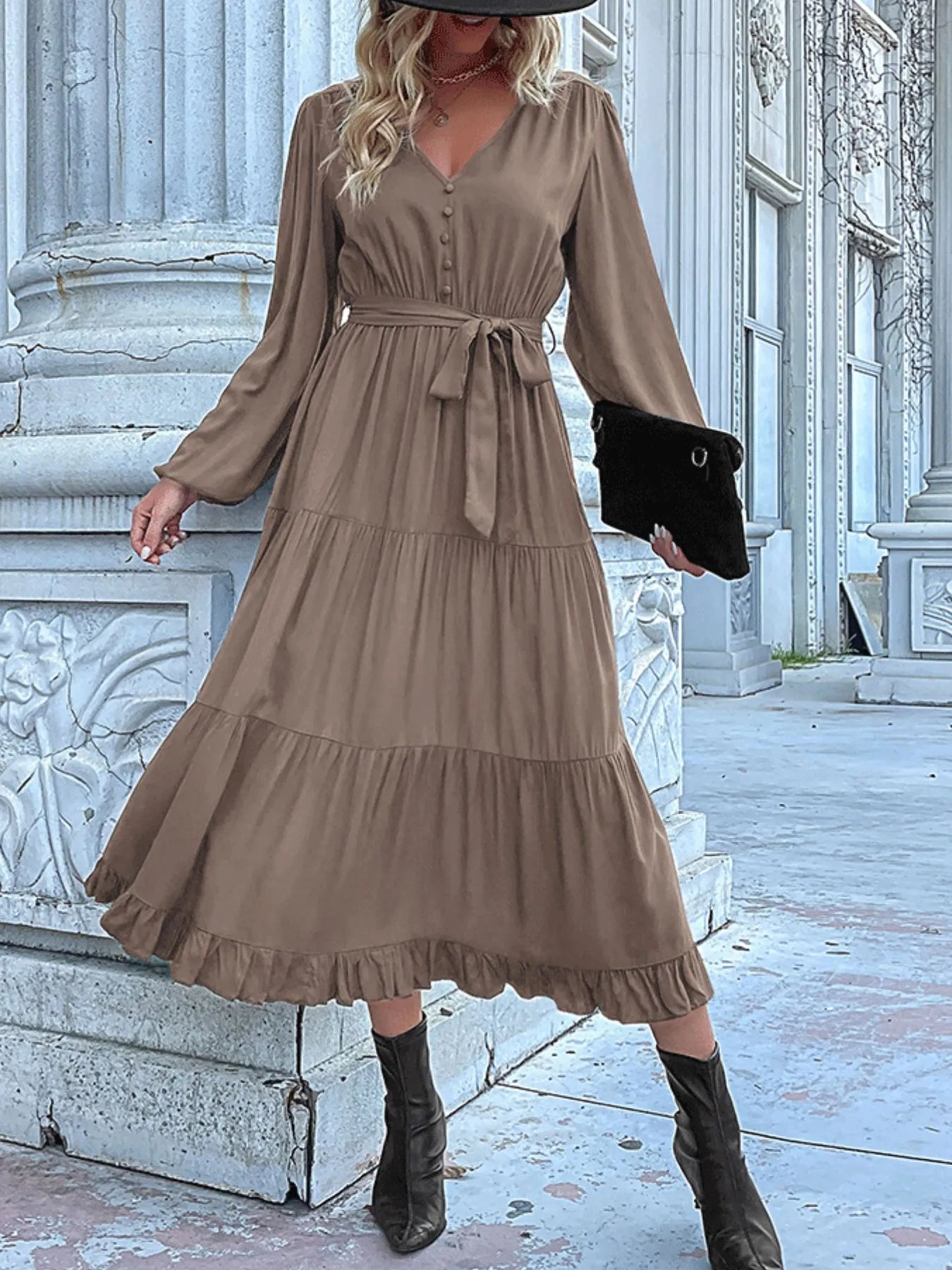 Ruffled Hem V-Neck Balloon Sleeve Dress