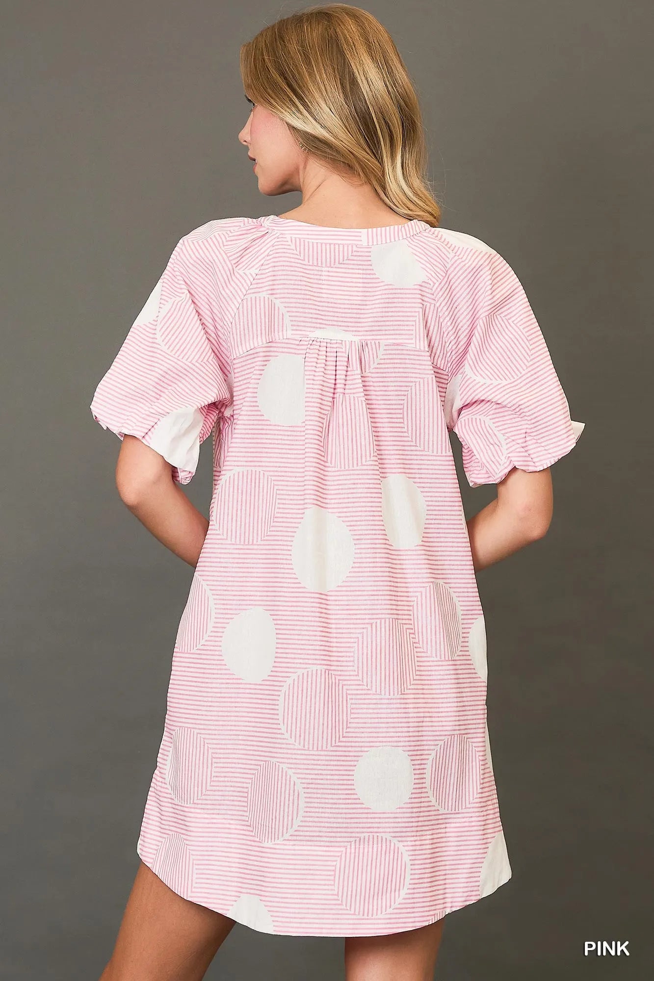 Umgee Stripe and Dot Print Button Down Puff Sleeve Mini Dress