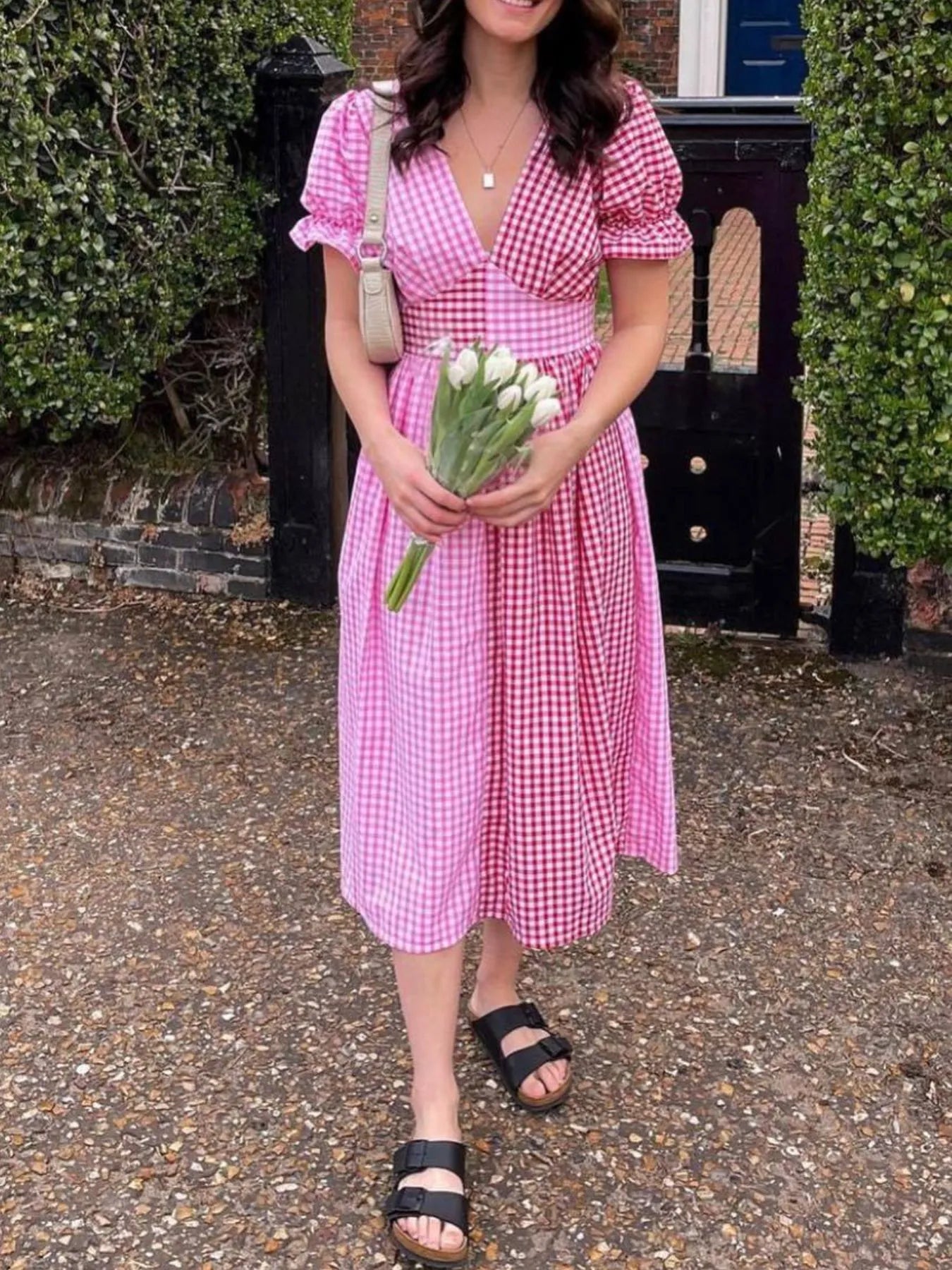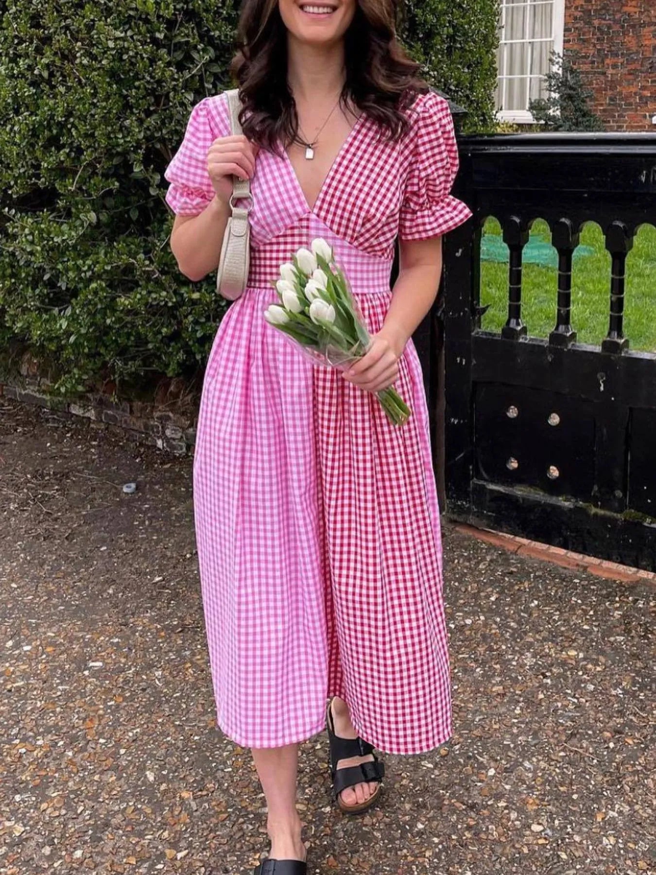 Plaid V-Neck Puff Sleeve Dress