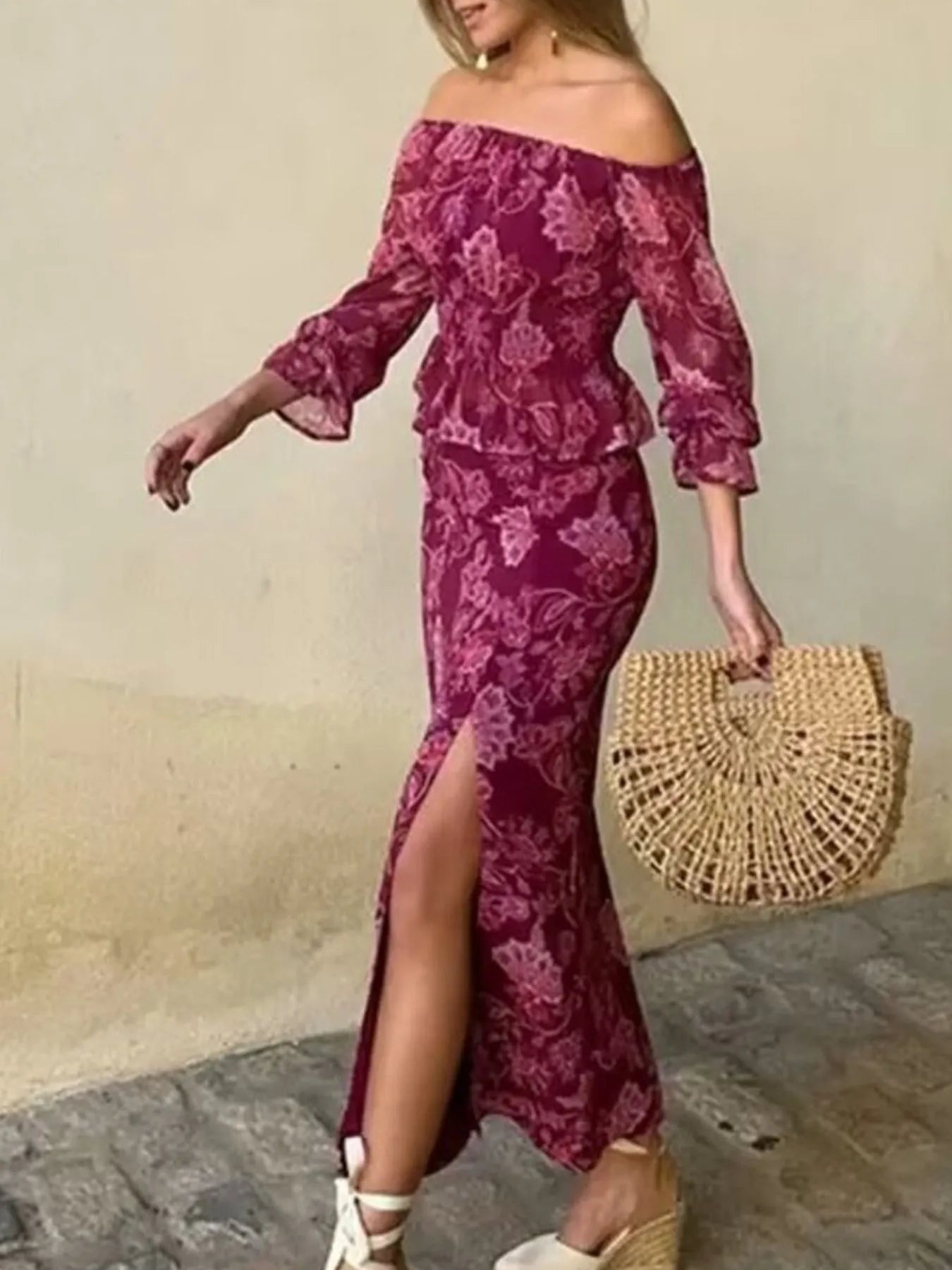 Printed Flounce Sleeve Top and Slit Skirt Set