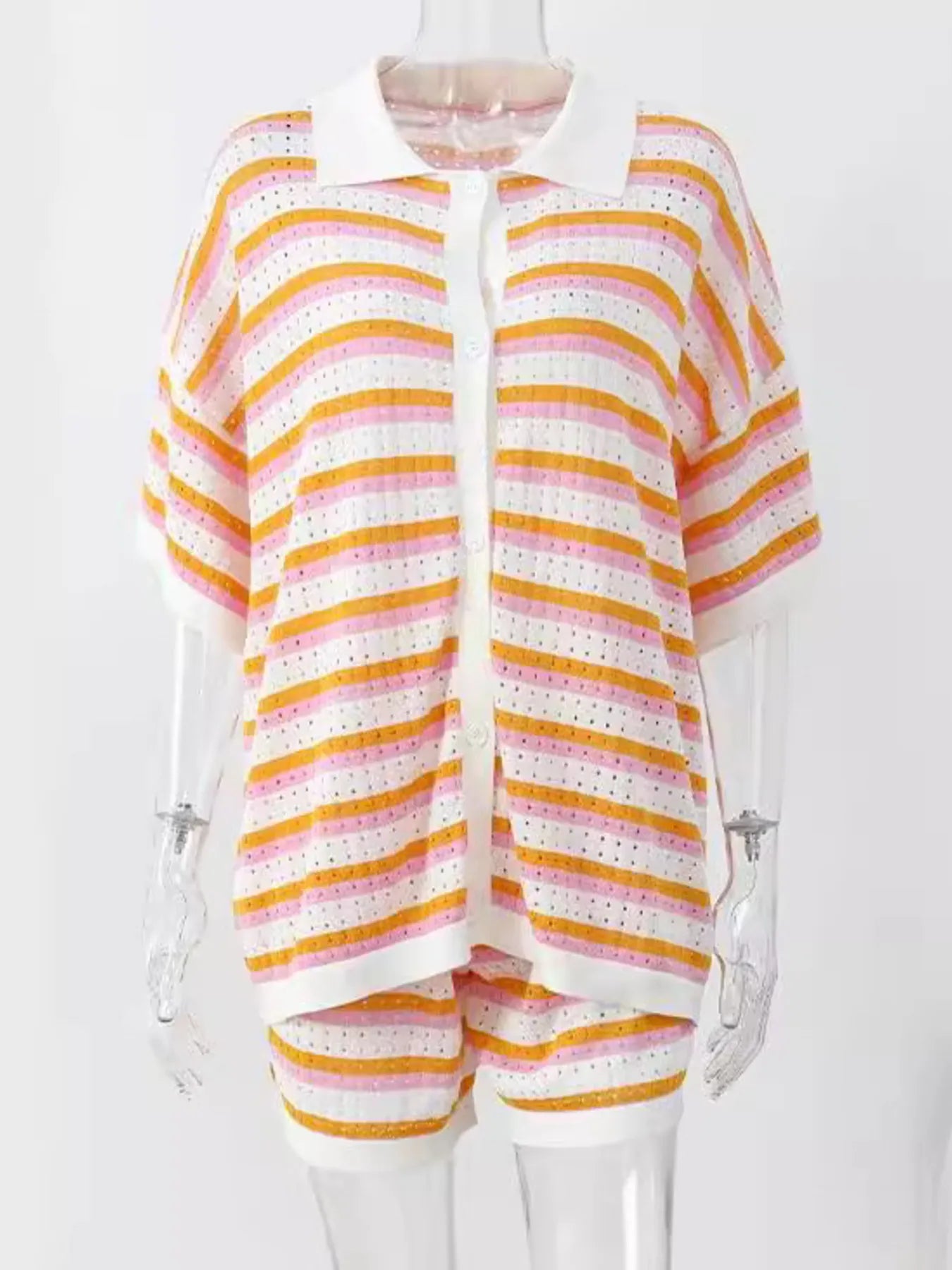 Striped Eyelet Button Up Shirt and Shorts Set