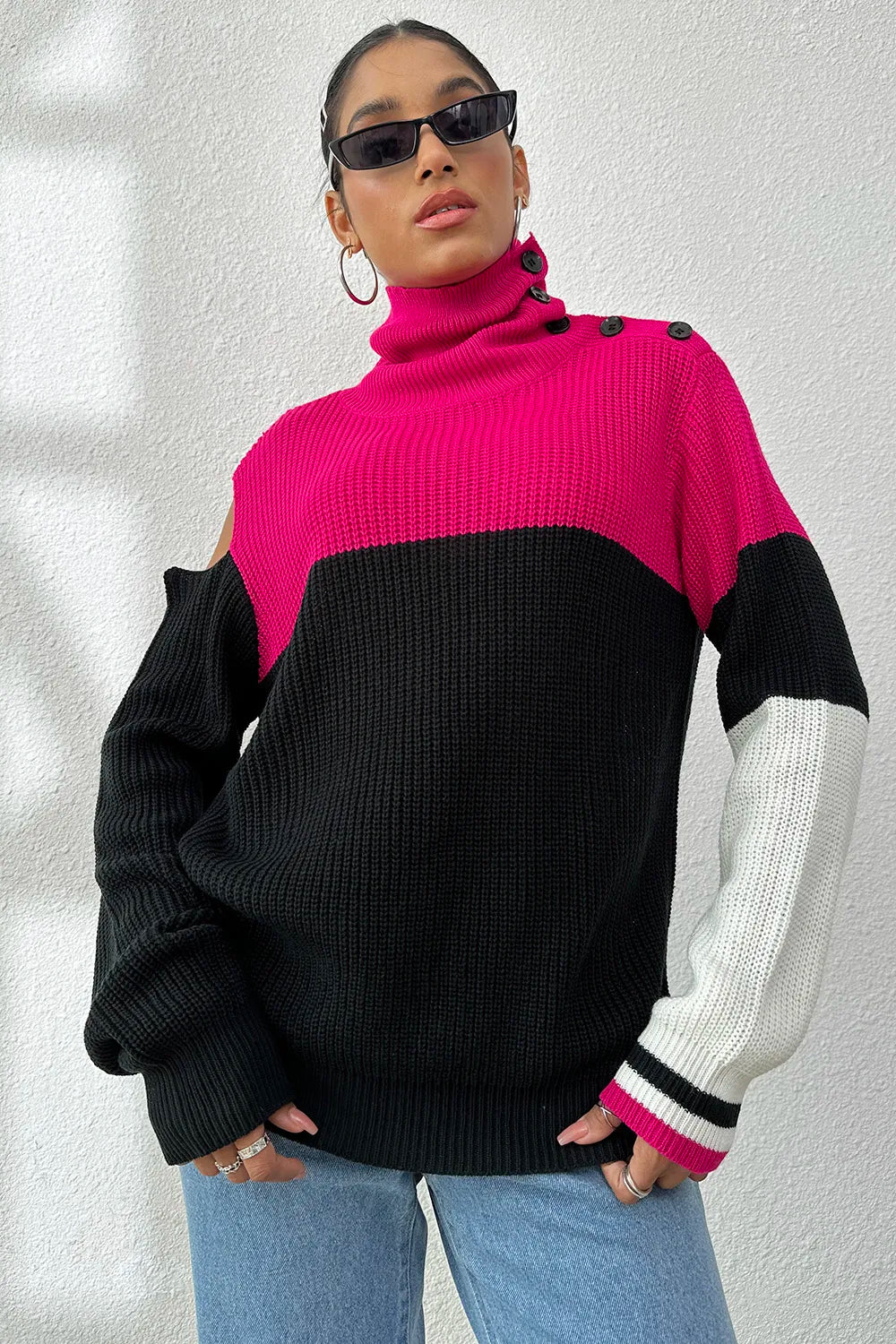 Contrast Buttoned Cutout Long Sleeve Sweater