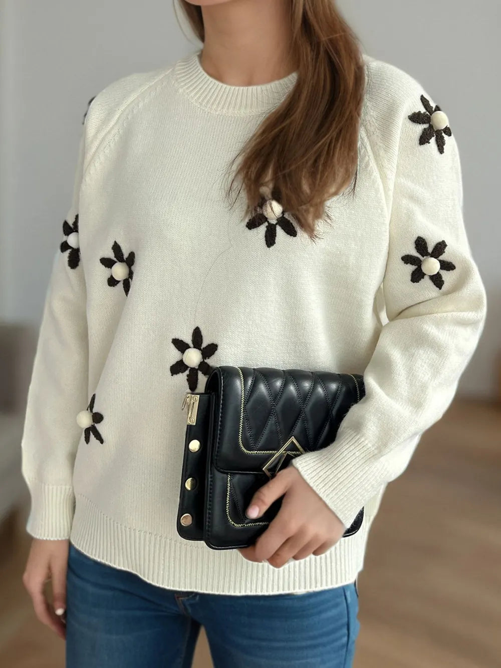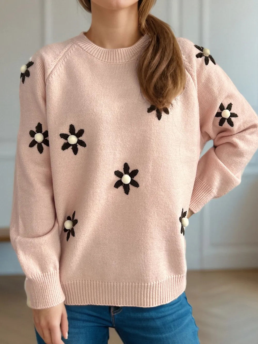 Flower Round Neck Raglan Sleeve Sweater