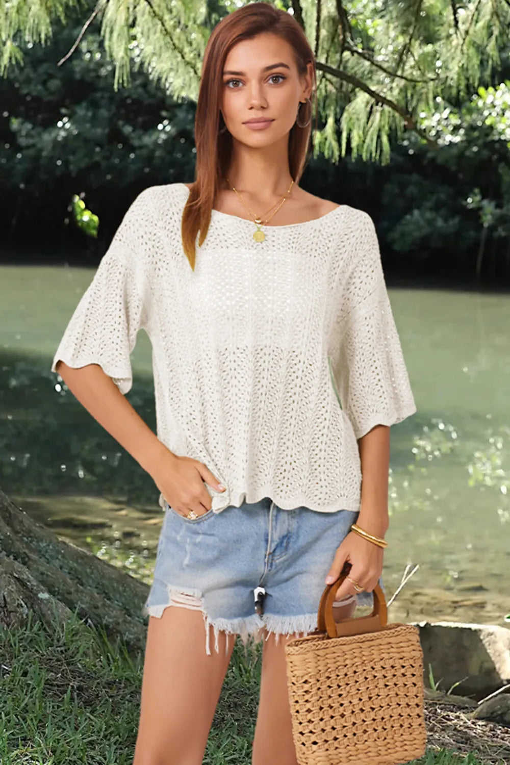 Openwork Round Neck Half Sleeve Knit Top
