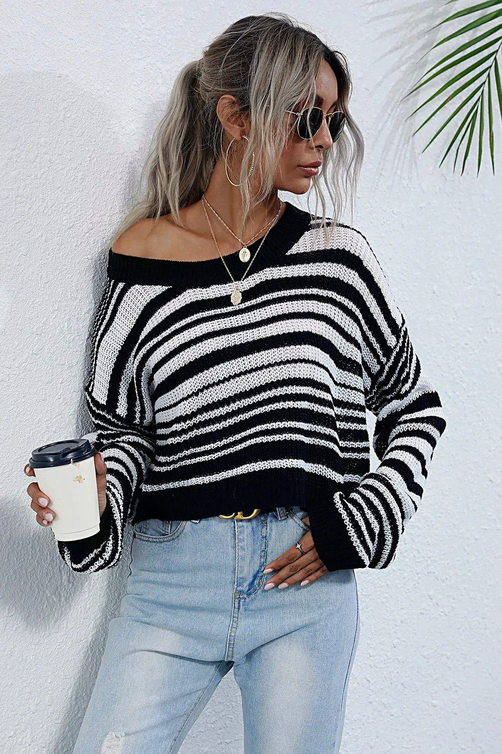 Perfee Striped Round Neck Dropped Shoulder Sweater