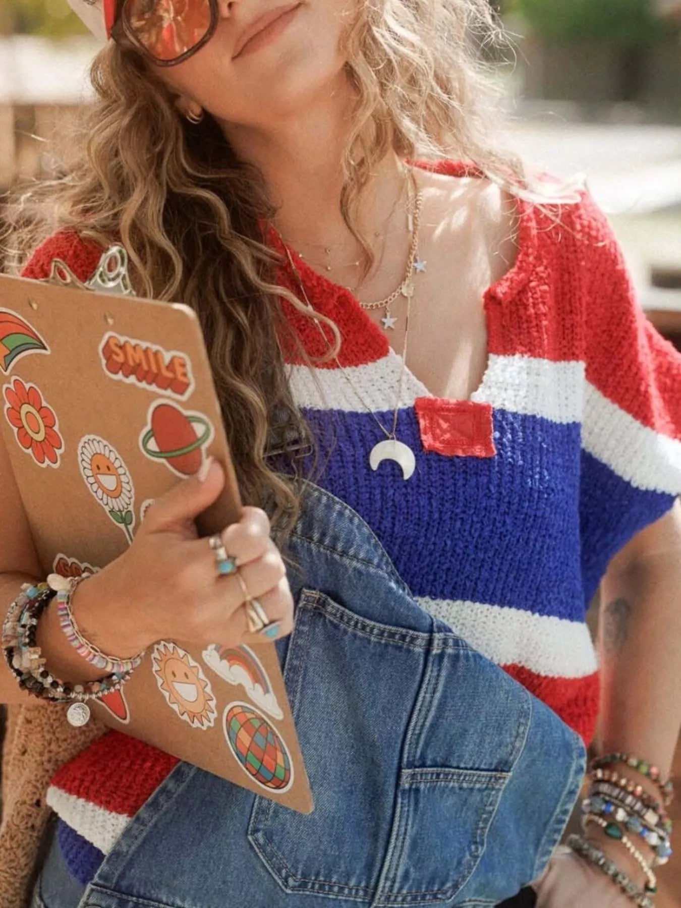 Striped Notched Short Sleeve Sweater