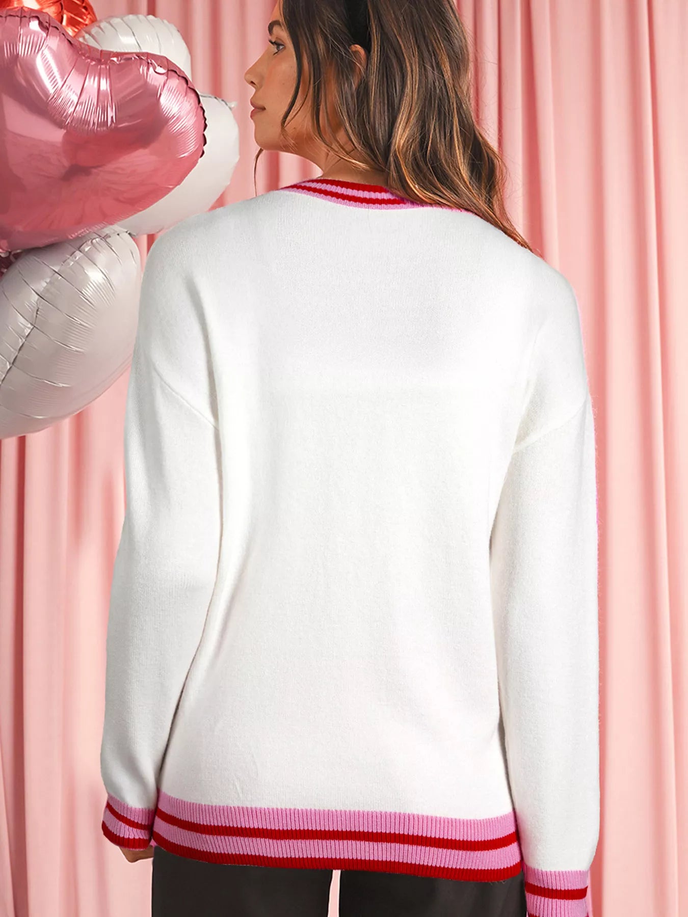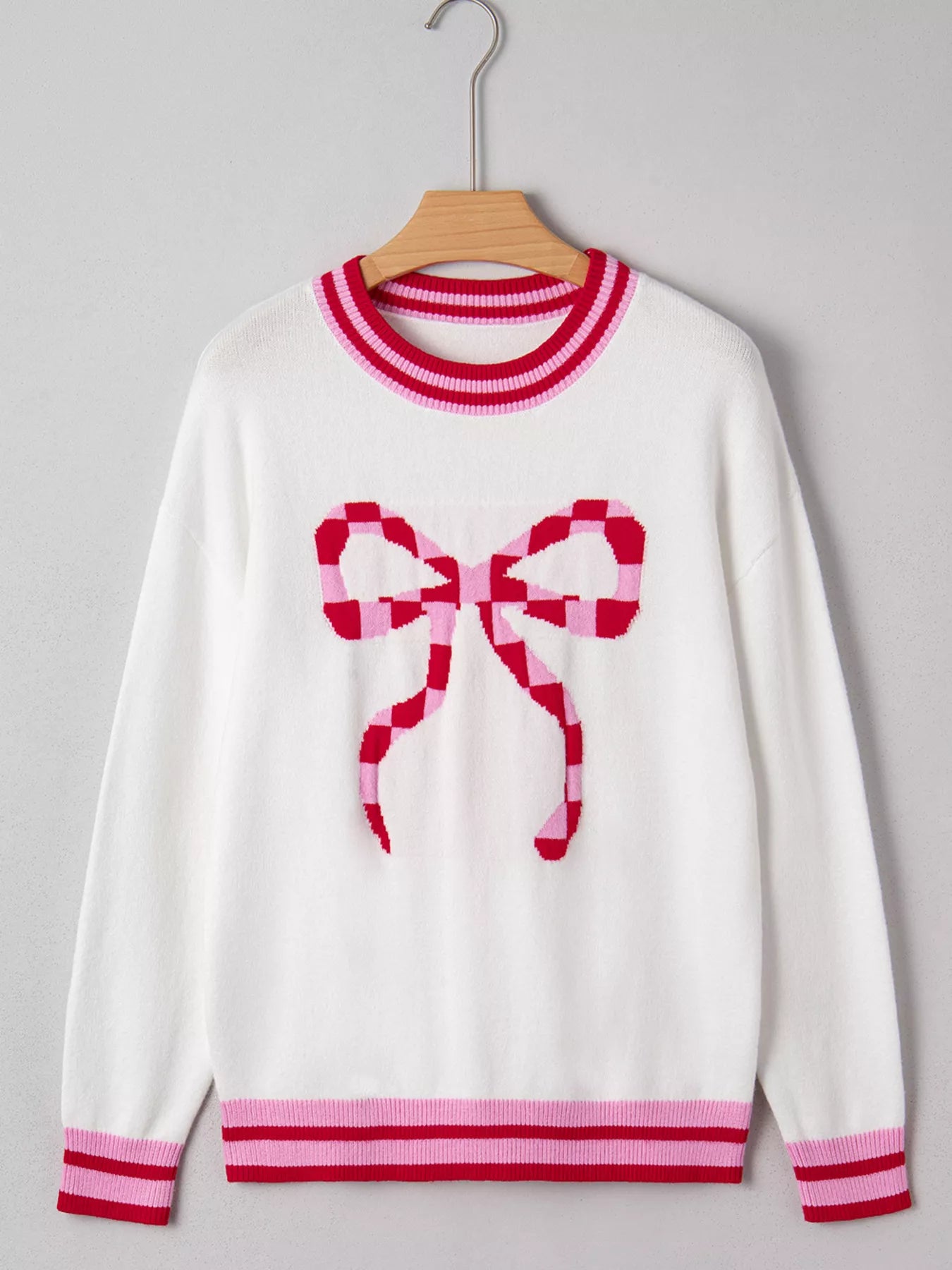 Striped Trim Bow Graphic Round Neck Drop Shoulder Sweater
