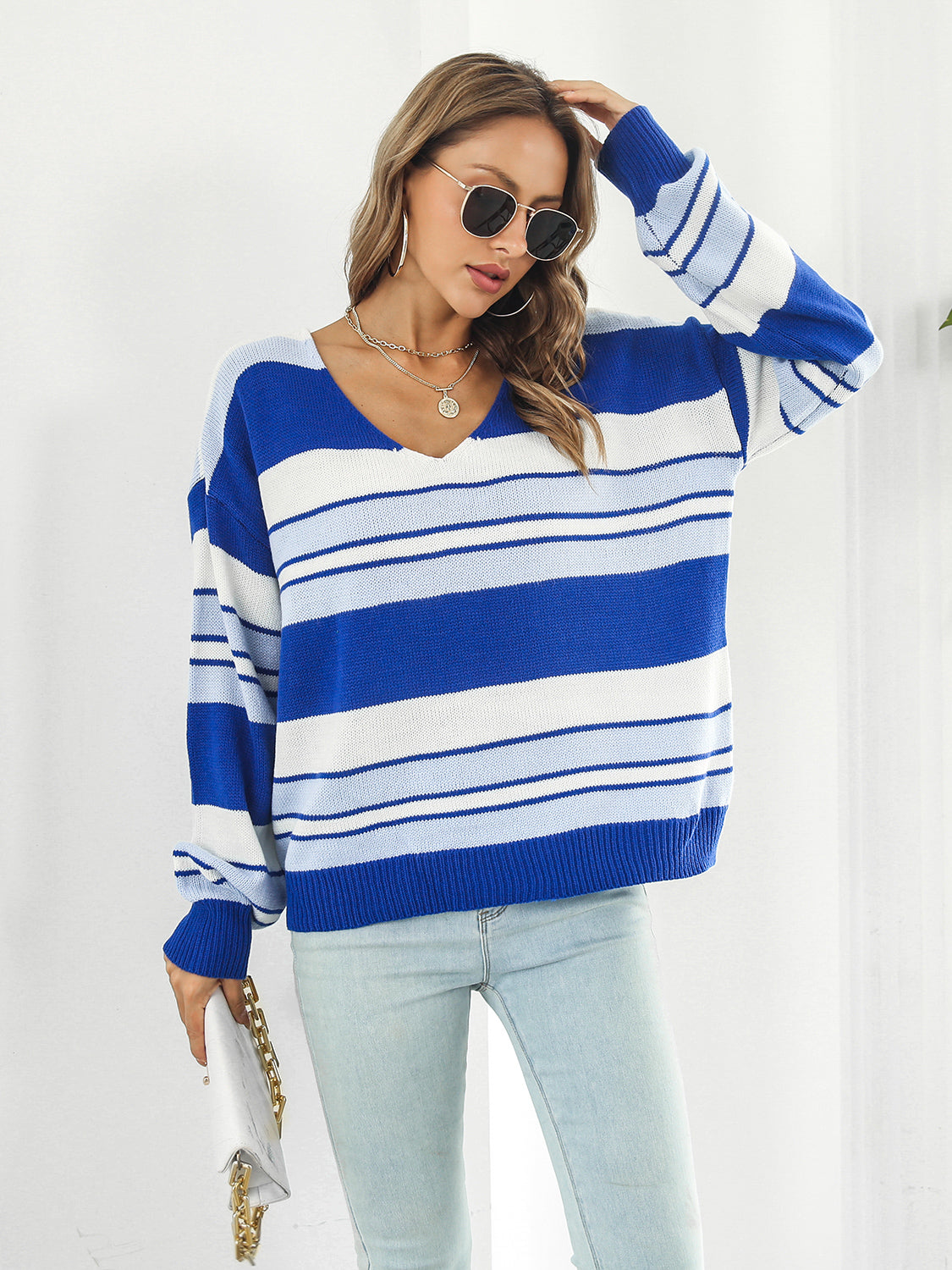 Striped V-Neck Long Sleeve Knit Top