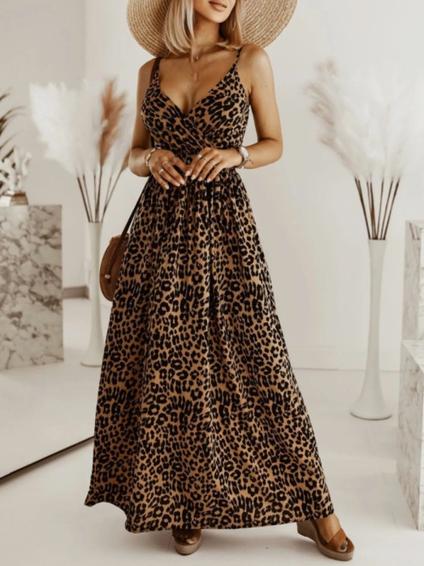 Leopard Print Spaghetti Strap Summer Maxi Dress