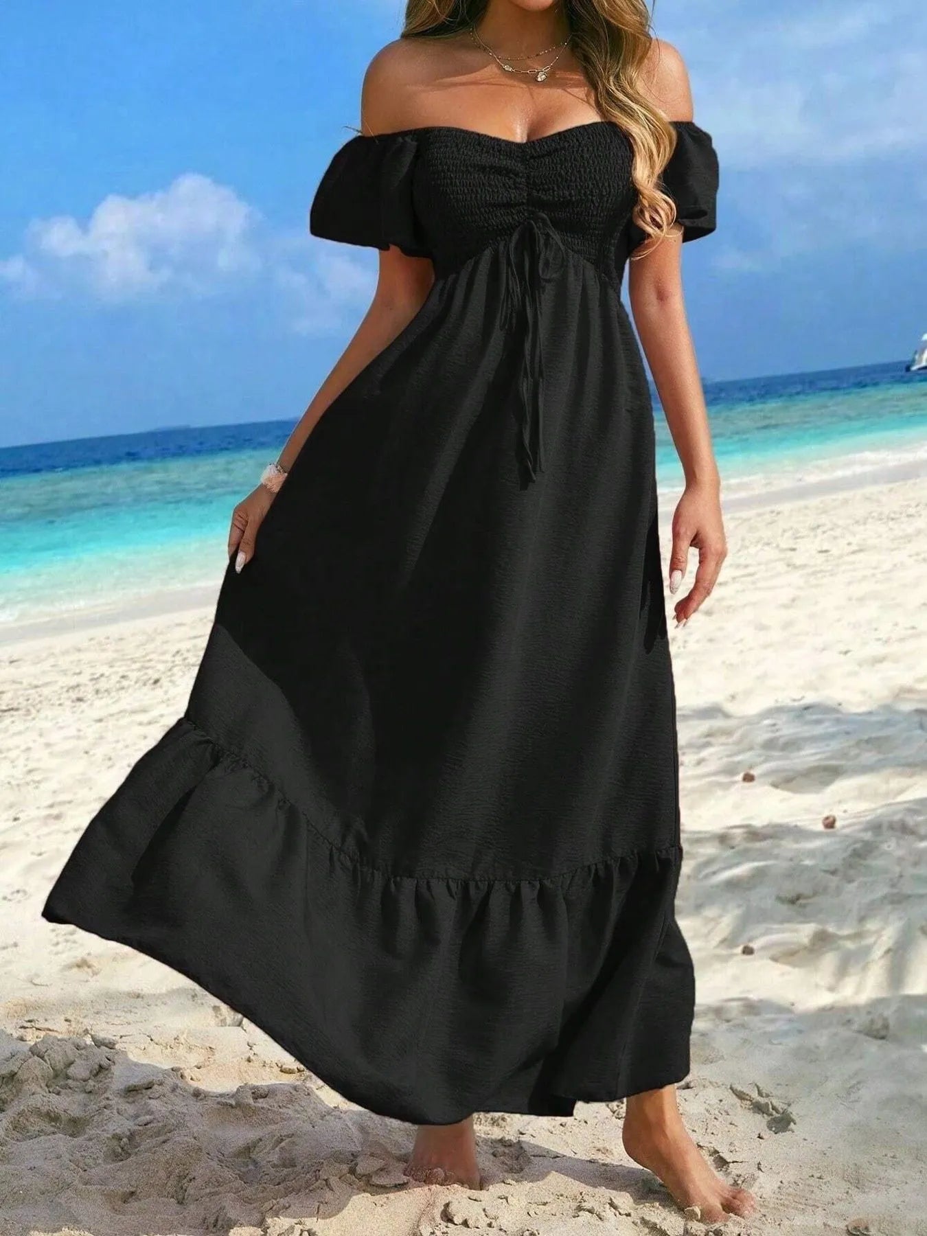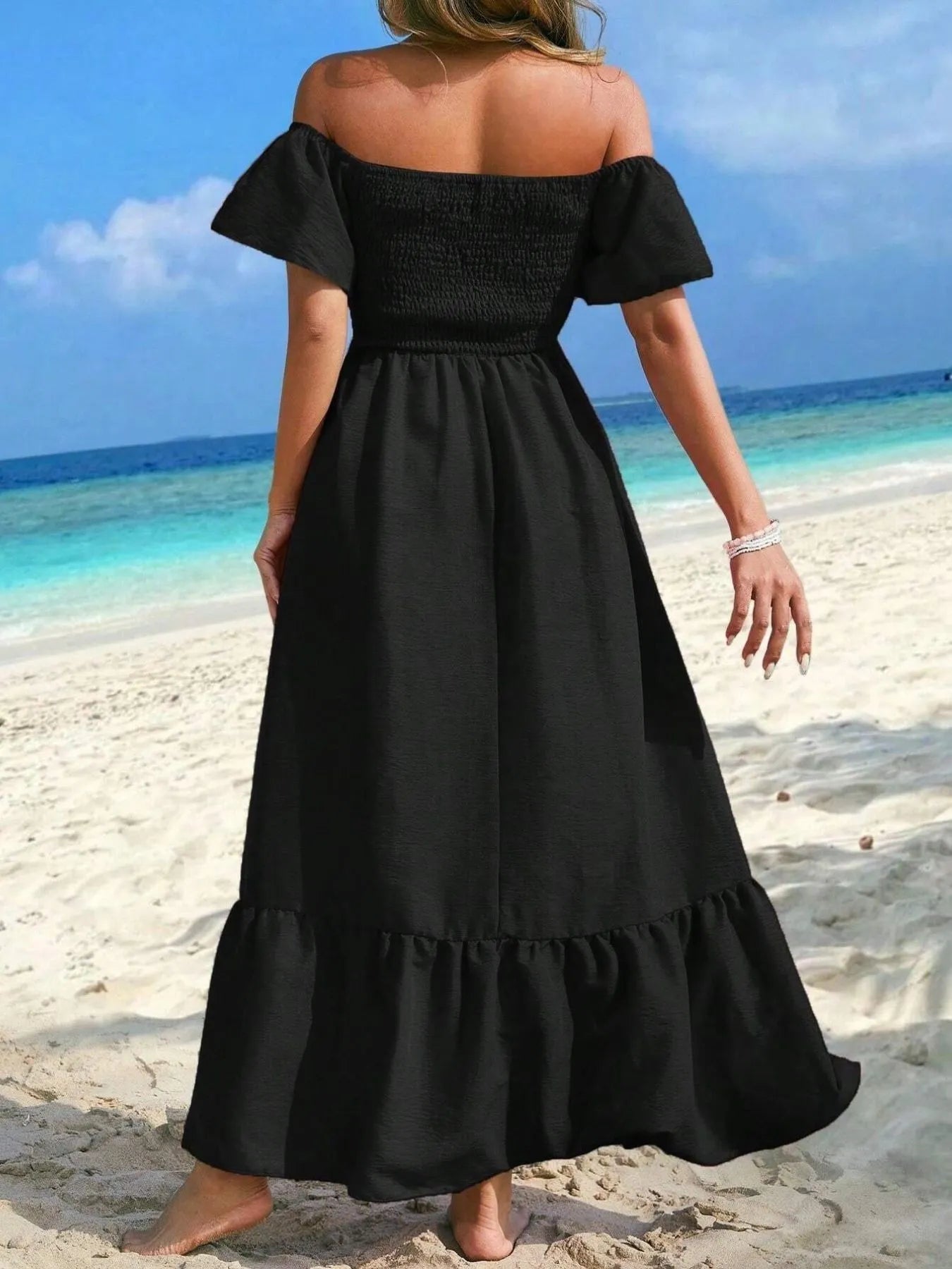 Off-Shoulder Smocked Maxi Dress with Ruffle Hem