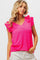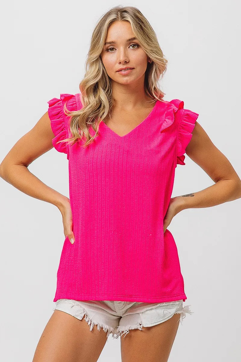 This stunning hot pink blouse features charming ruffle shoulder details and a flattering V-neckline that creates an elegant feminine silhouette. Made from lightweight textured fabric with a subtle ribbed finish, this sleeveless top offers comfortable wear perfect for warm weather. The vibrant fuchsia color makes it a standout statement piece, while the relaxed fit ensures all-day comfort. The delicate ruffle accents on the shoulders add a romantic touch, making it ideal for casual outings, weekend brunches, or summer gatherings. Easy to care for and versatile to style with jeans, shorts, or skirts.