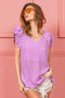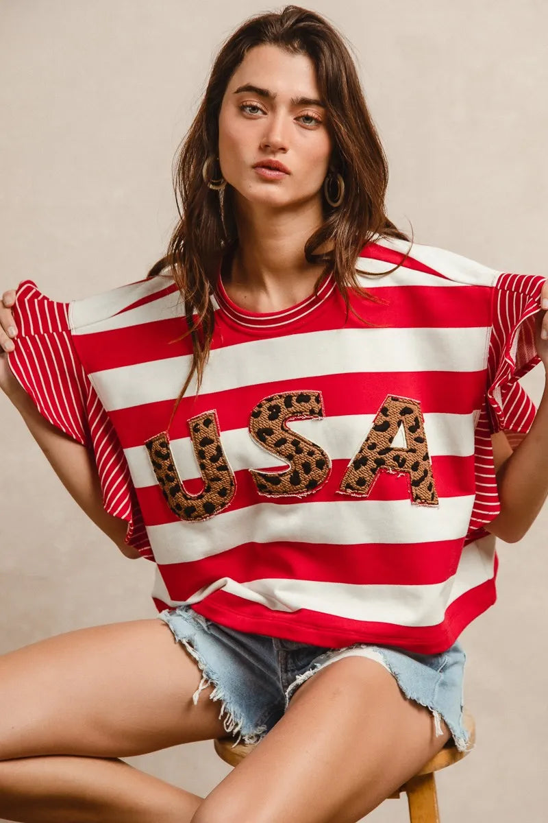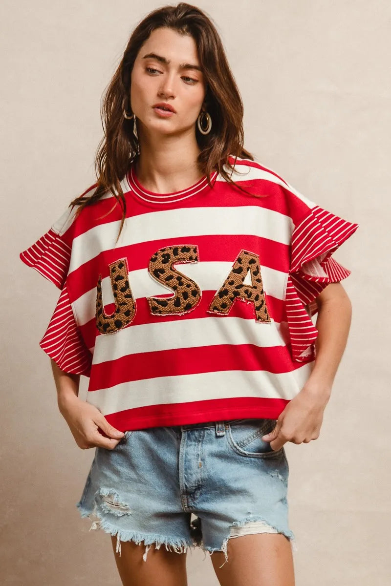 BiBi Stripe Mixed Ruffle Sleeve Top With Leopard Letter
