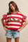 This stylish striped blouse features eye-catching red and white horizontal stripes with a fashion leopard print graphic accent. Made from comfortable cotton blend fabric, it offers a relaxed fit perfect for casual wear. The distinctive ruffle sleeves add a feminine touch while the bold stripe pattern creates a modern, playful look. The round neckline and short sleeves make it versatile for layering or wearing alone. Perfect for everyday casual outings, weekend activities, or creating effortless street style looks.