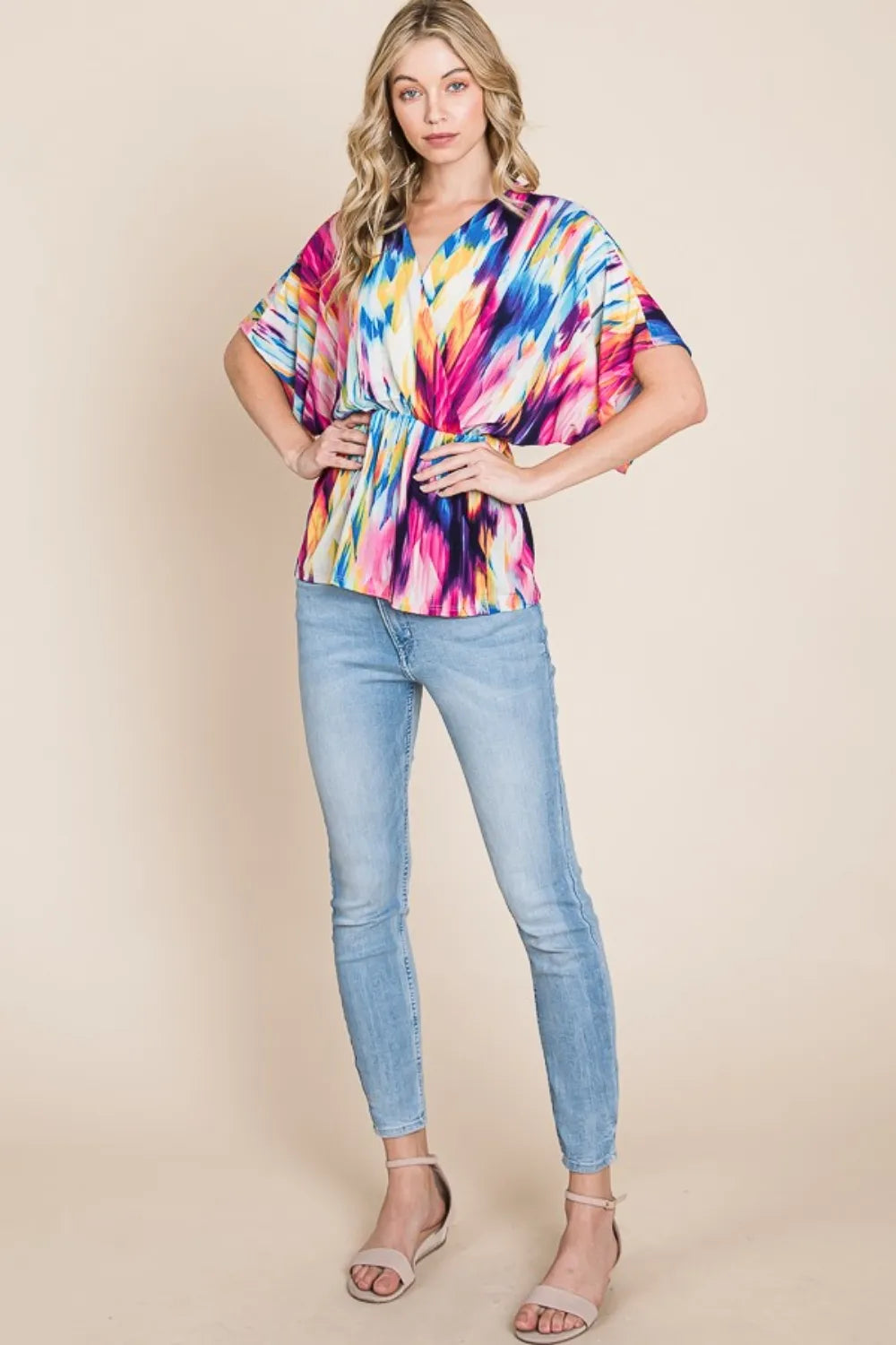 This Printed Surplice Peplum Blouse is a fashionable and versatile piece for your wardrobe. The surplice neckline adds a flattering and modern touch to the blouse. The peplum hem creates a stylish silhouette that accentuates the waist. Made from a lightweight and flowy fabric, this blouse is comfortable for all-day wear. The printed pattern adds a pop of color and visual interest to your outfit. Pair it with tailored pants for a polished office look, or with jeans for a casual yet chic ensemble. Upgrade your collection with this trendy and flattering blouse today!