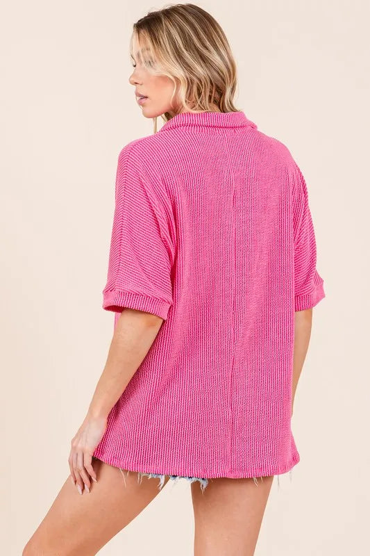 The ribbed collar top is a classic and versatile piece for your wardrobe. The ribbed texture adds depth and style to the top, while the collar neckline offers a polished and sophisticated look. Perfect for layering under jackets or cardigans, this top can easily transition from day to night. Pair it with jeans or trousers for a timeless and put-together outfit that exudes both comfort and elegance.