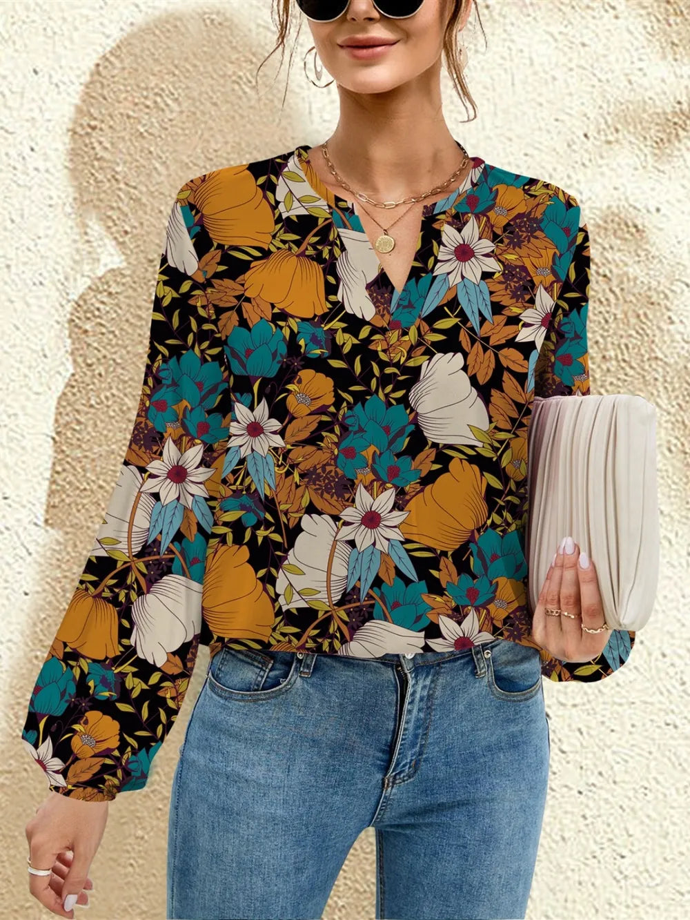 FAM-FAM Printed Notched Long Sleeve Blouse