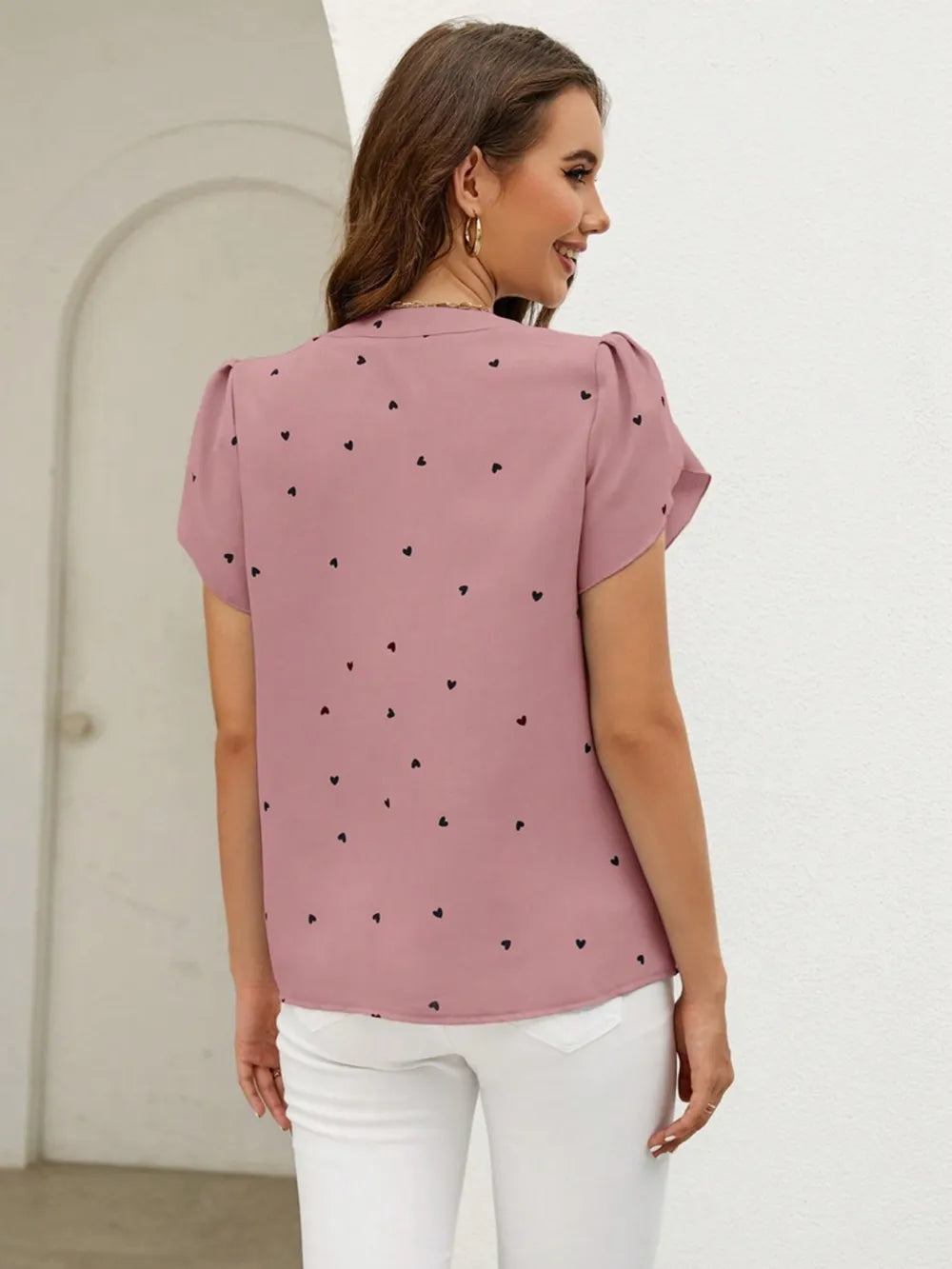 Heart Print Notched Petal Sleeve Blouse