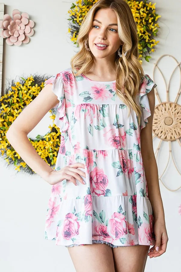 This short sleeve top features a beautiful floral print with tiered butterfly sleeves. The round neck adds a classic touch to the design. A feminine and playful addition to your wardrobe for a charming and stylish look.