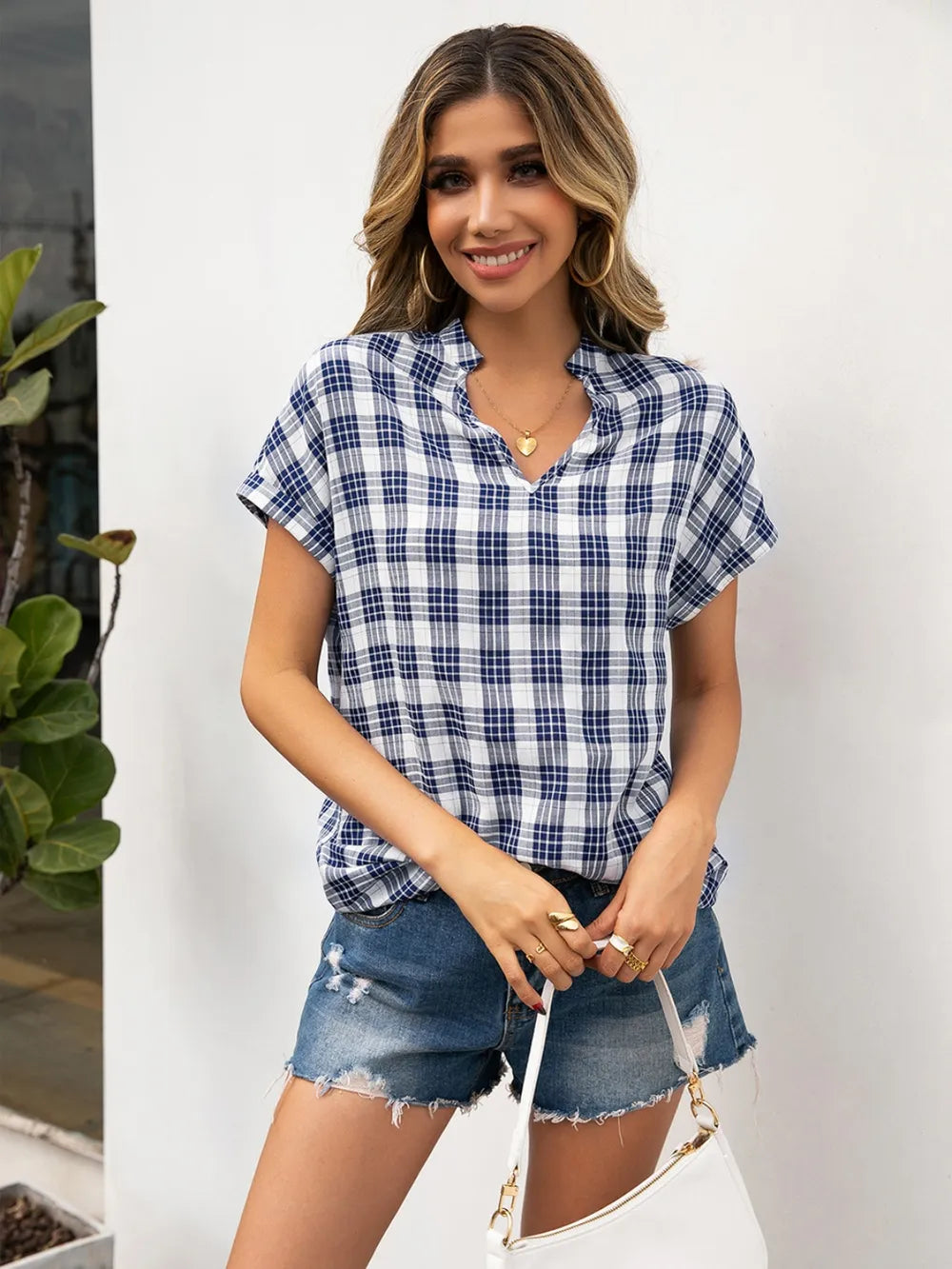 Ivy Lane Plaid Notched Short Sleeve Blouse