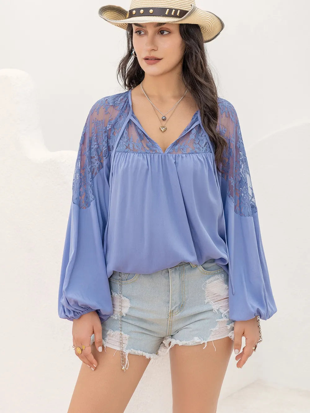 Lace Detail Tie Neck Balloon Sleeve Blouse