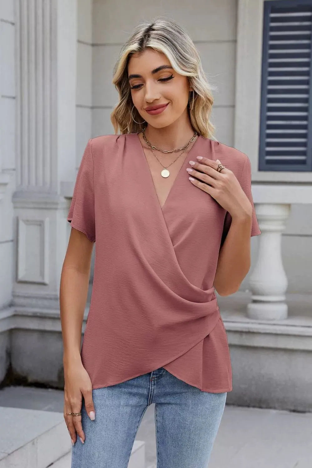 Solid Color Surplice Short Sleeve Blouse