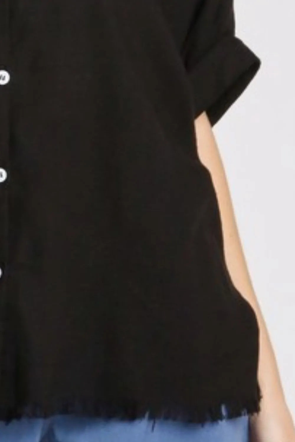 - Features: Buttoned, Raw Hem