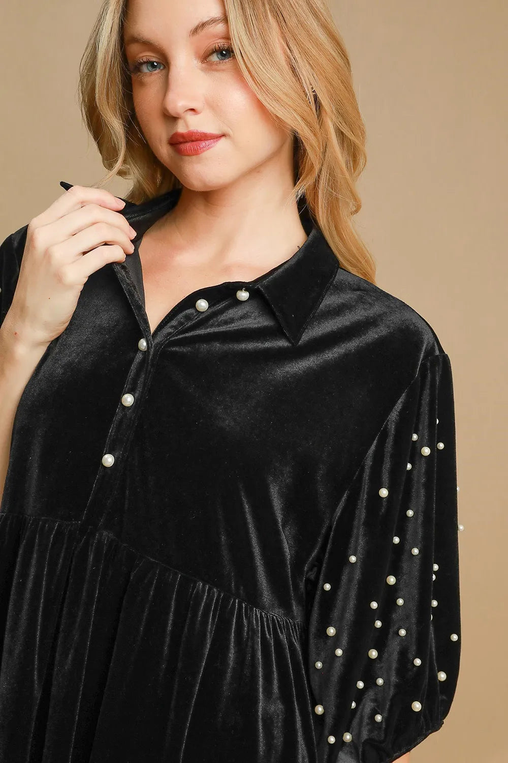 Umgee Pearl Detail Half Sleeve Velvet Babydoll Blouse