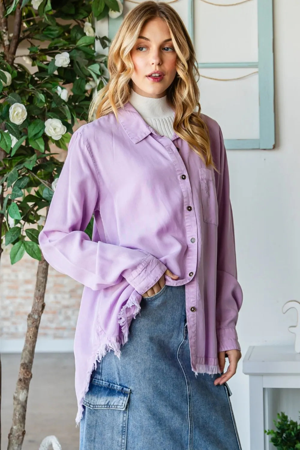 Veveret Raw Hem Button Up Long Sleeve Shirt